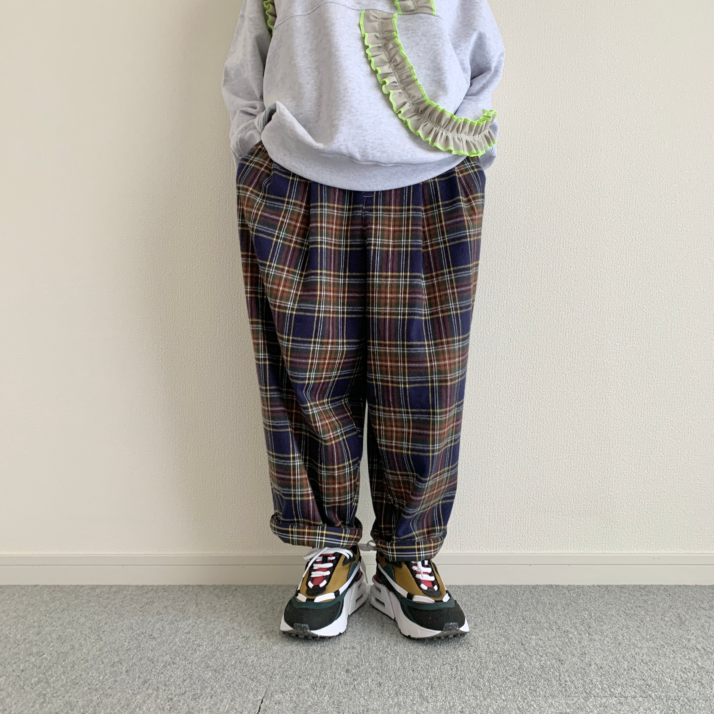 nancoinancoi 2 tuck tapered loose fit brushed check pants / navy