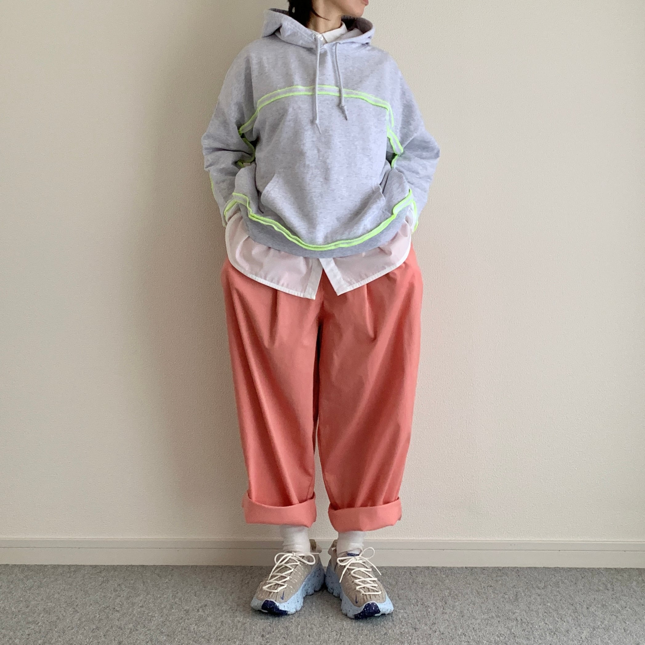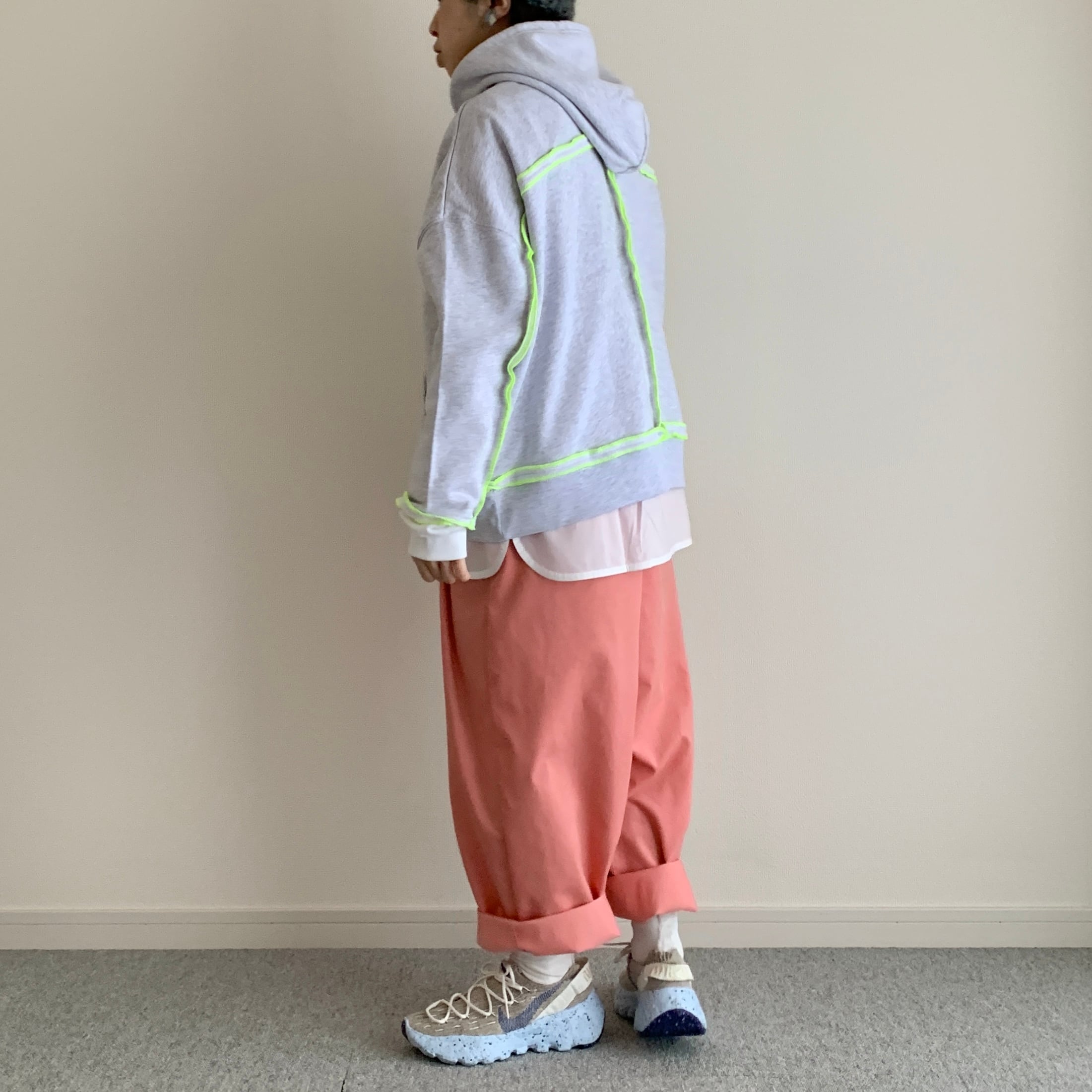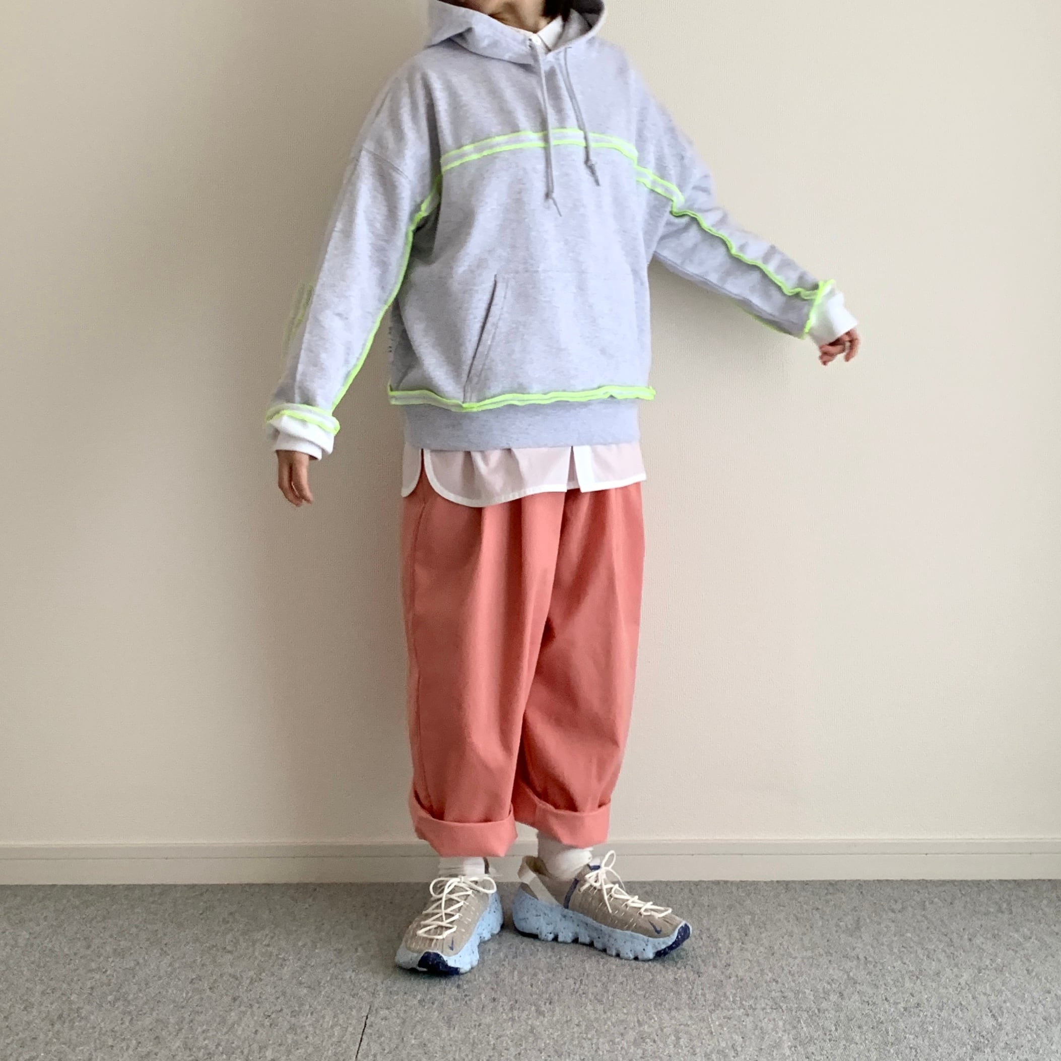 ネオンイエローのステッチが特徴的なプルオーバーパーカーです。