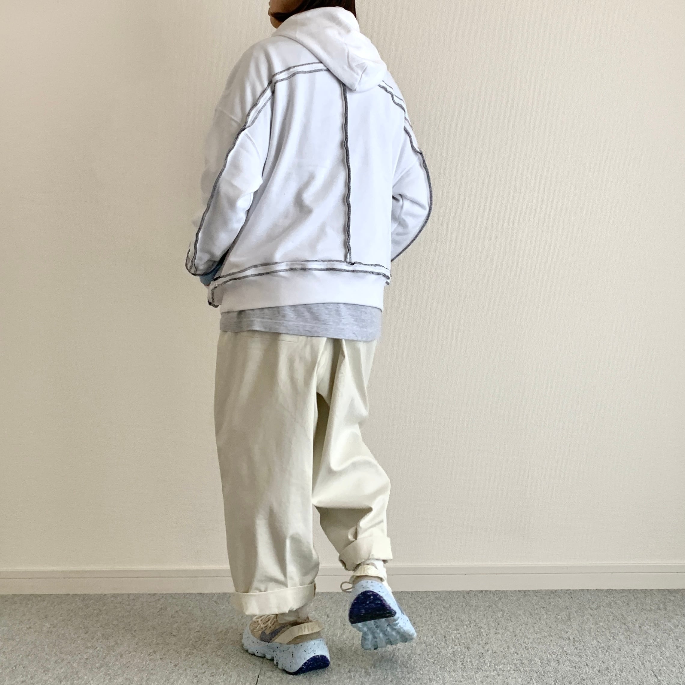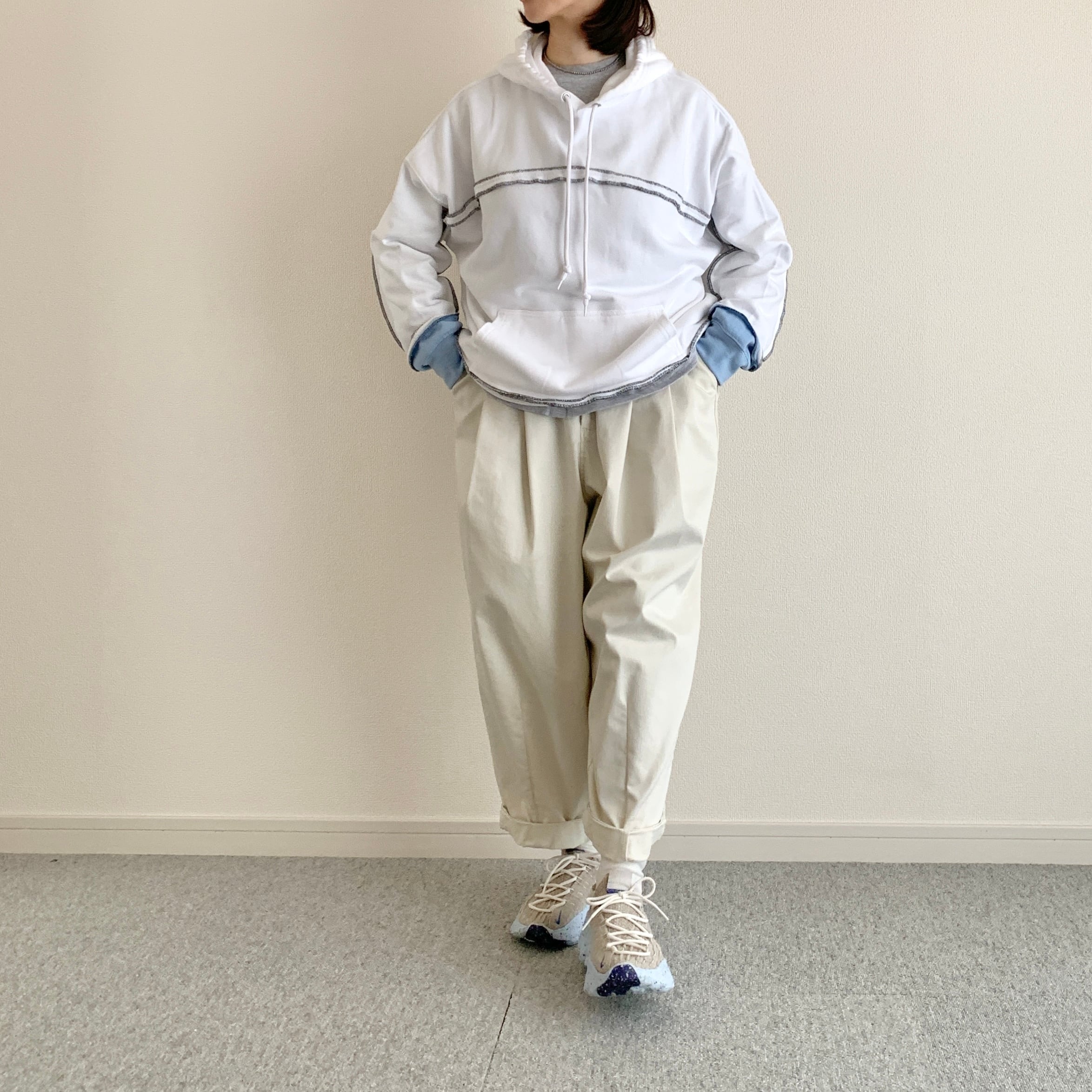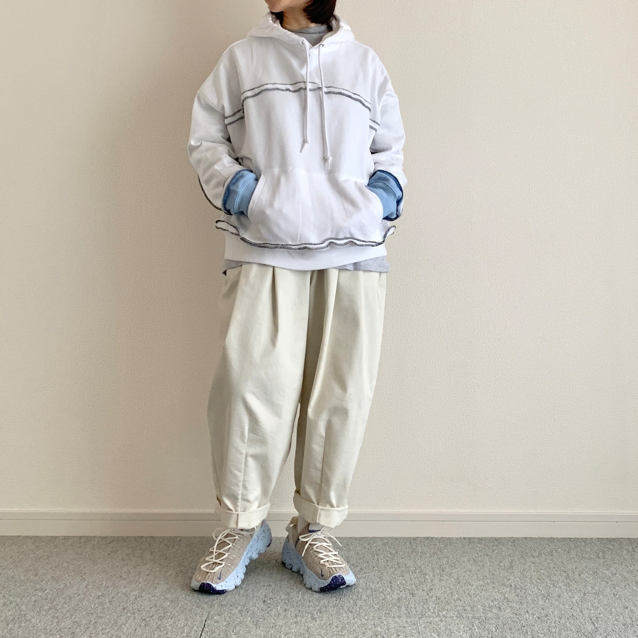 白いボディのスウェットは身幅広めのワイドシルエット。