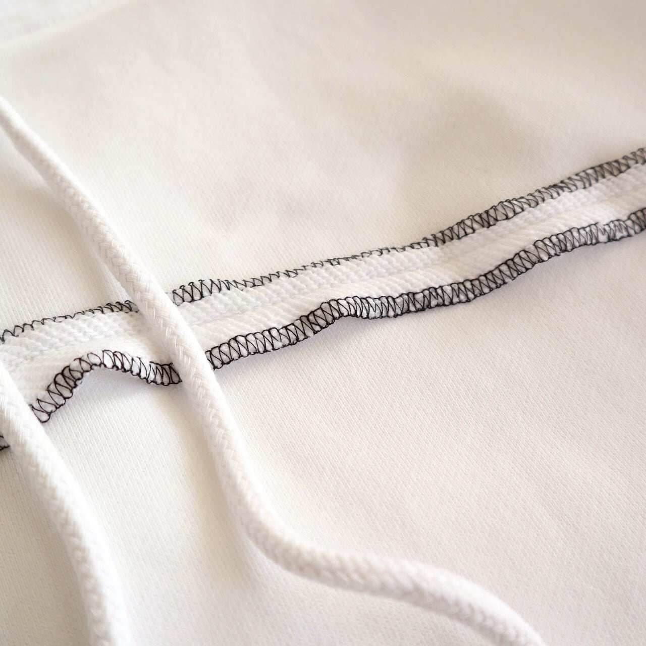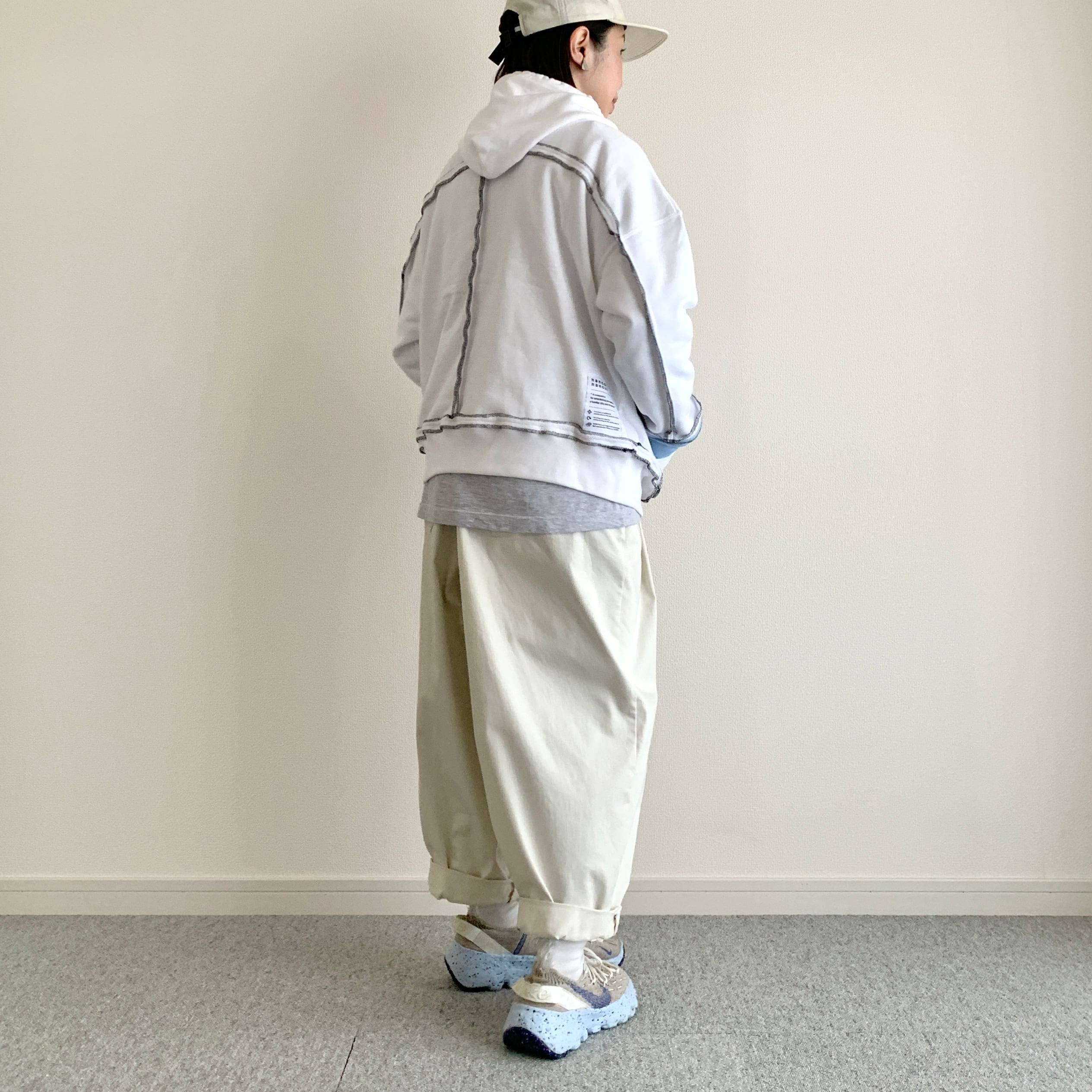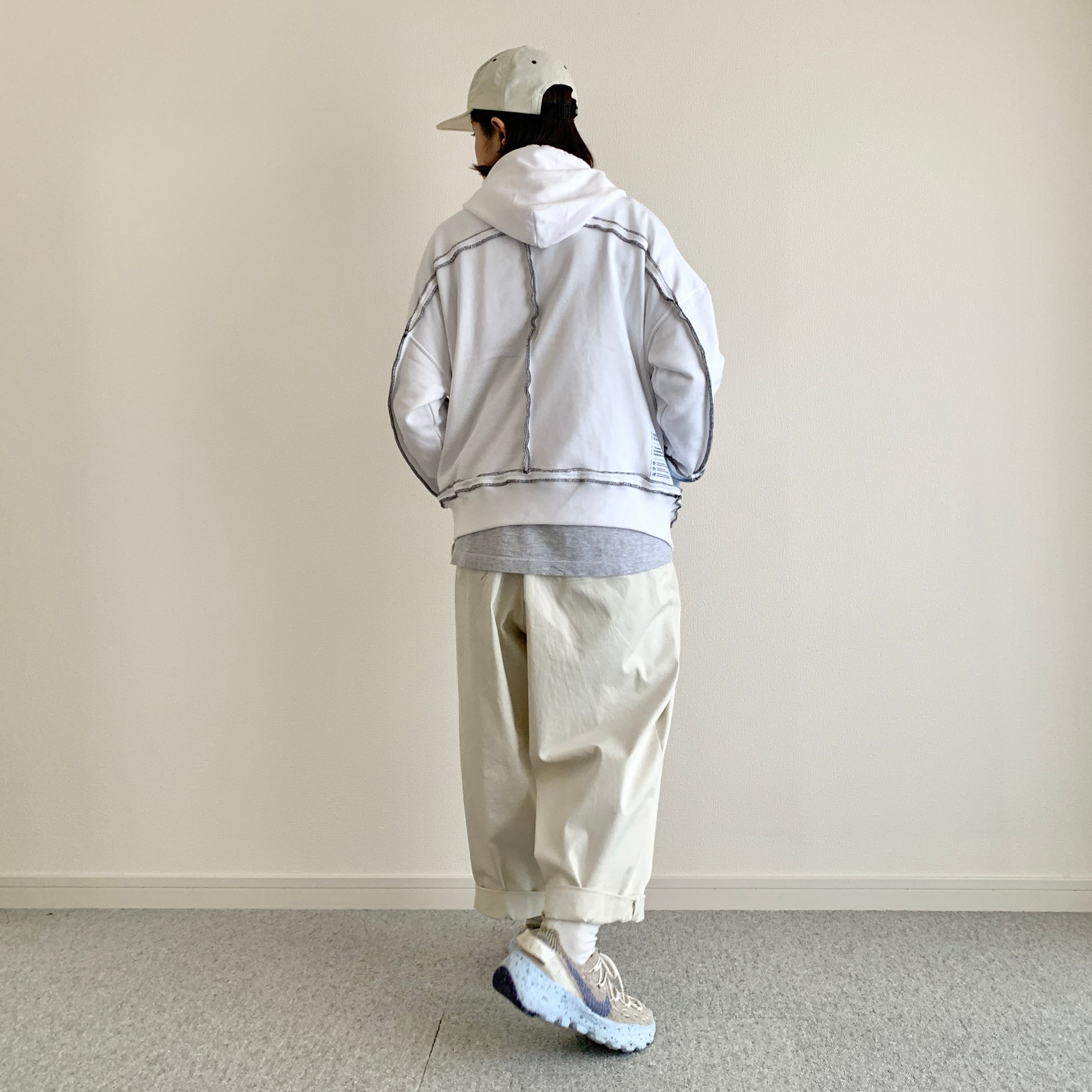 白いボディのスウェットは身幅広めのワイドシルエット。