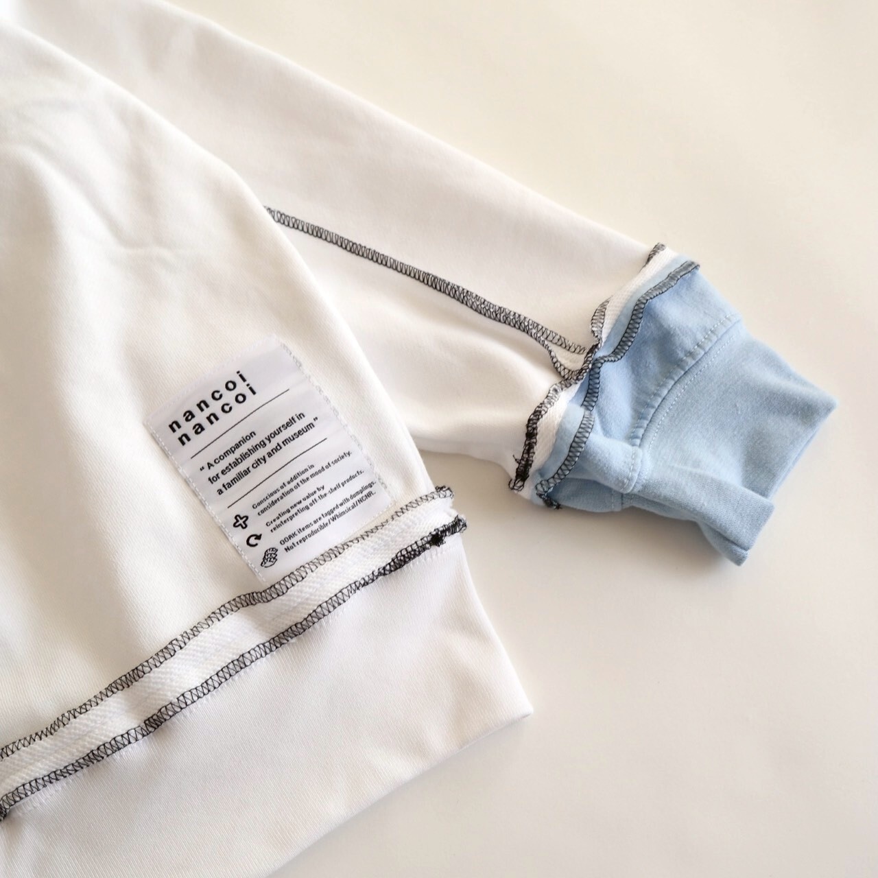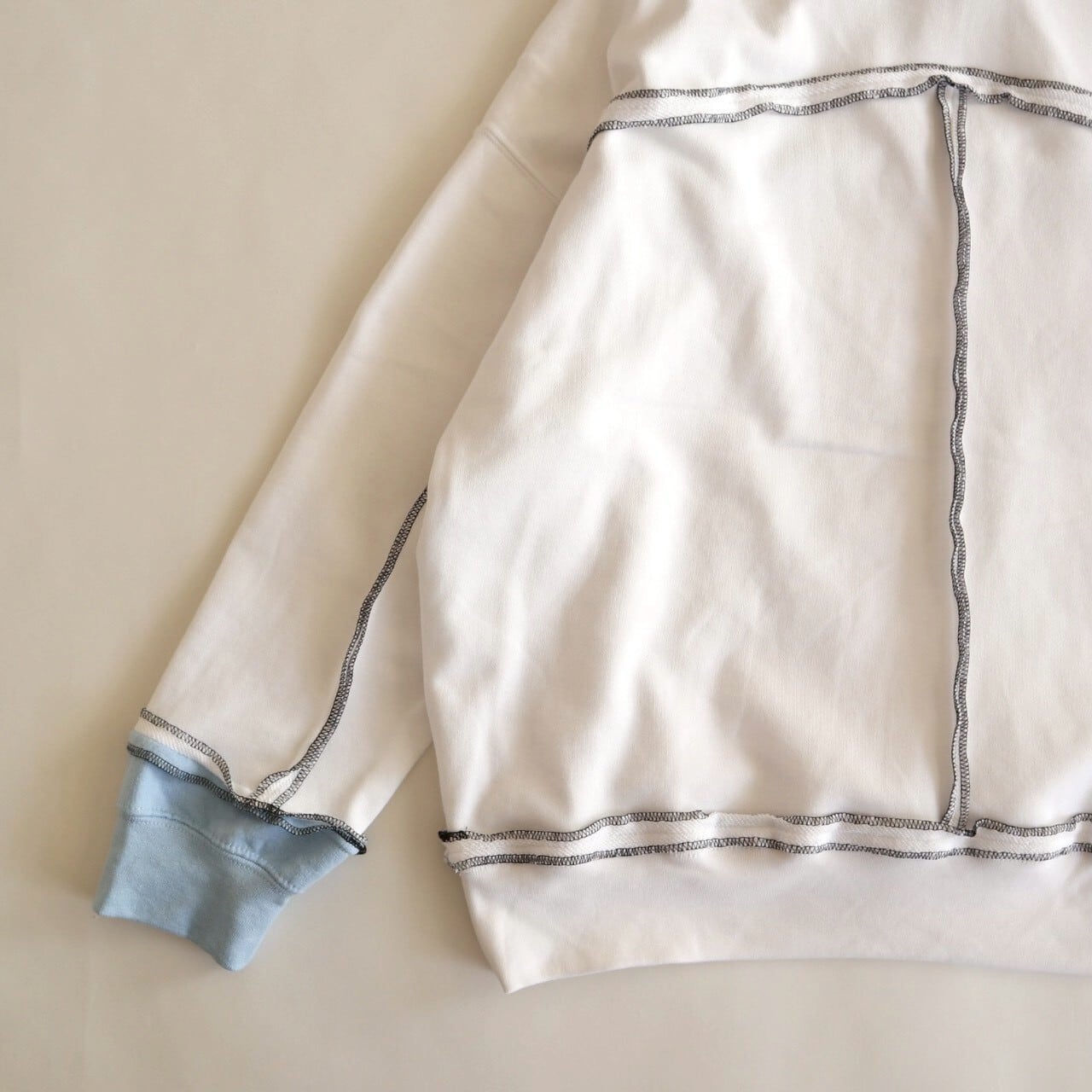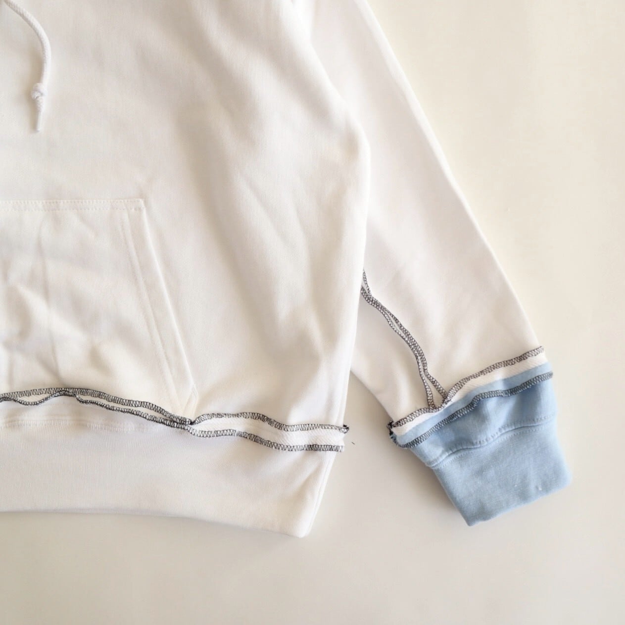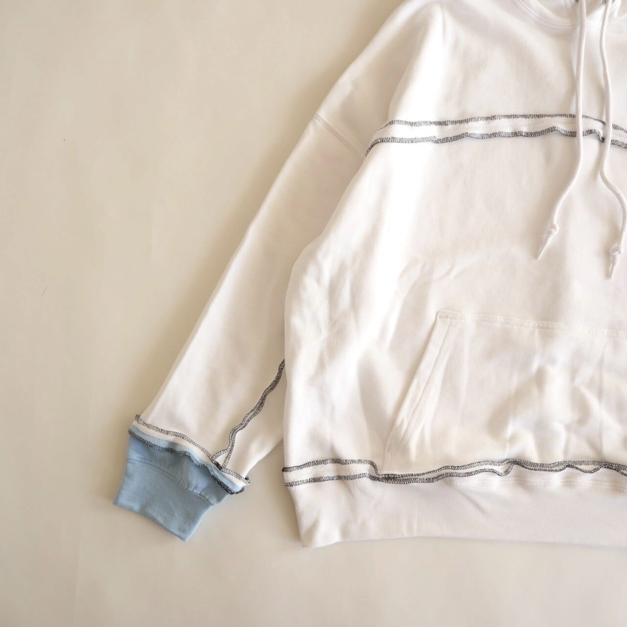 ブラックのステッチと水色の袖リブが特徴的なプルオーバーパーカーです。