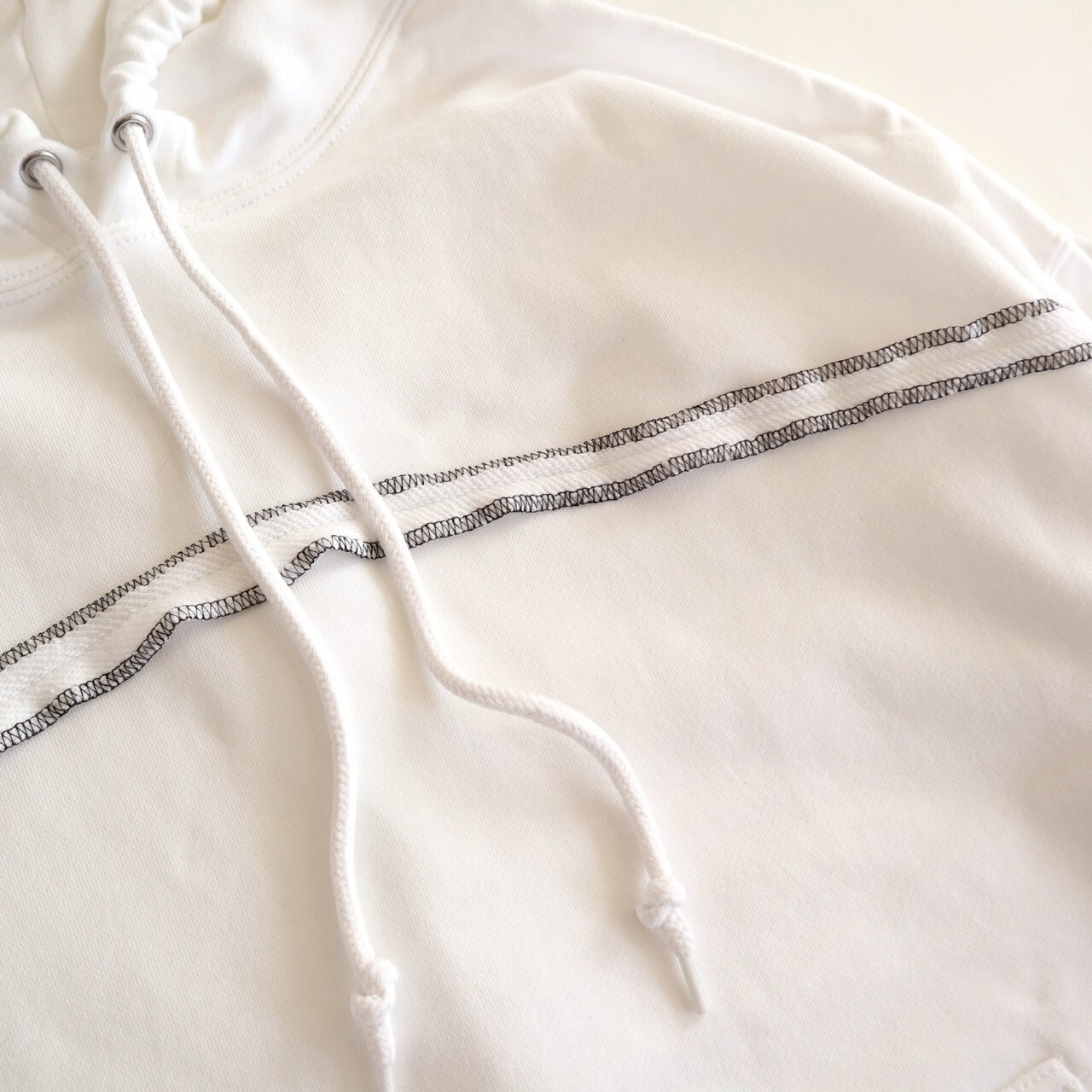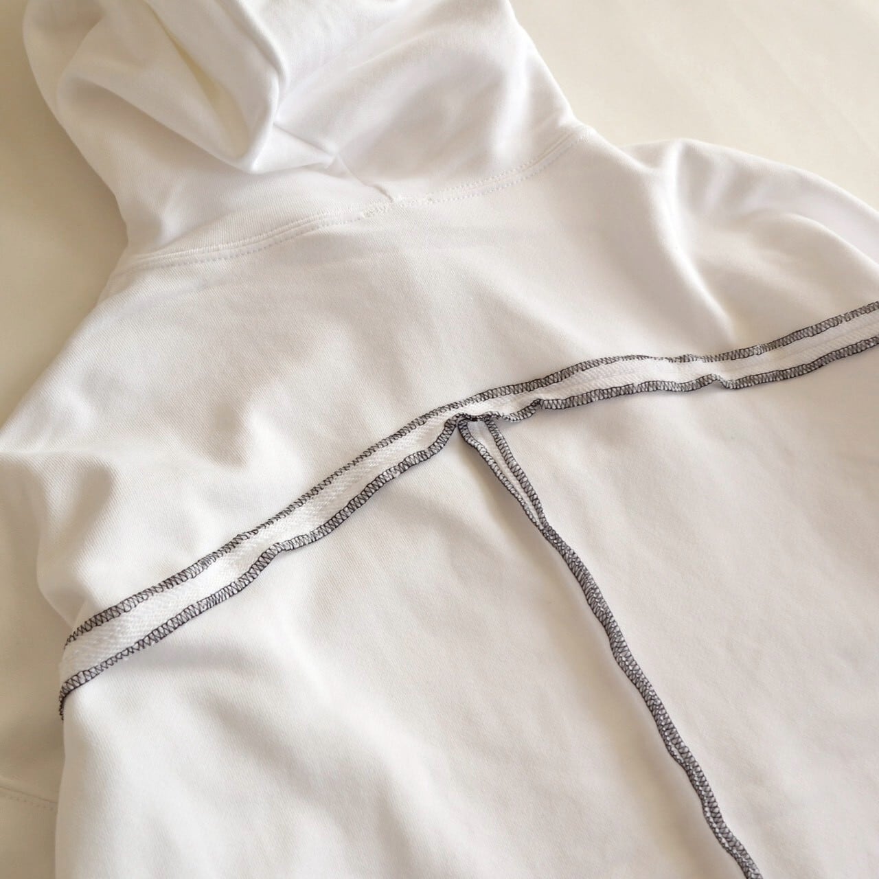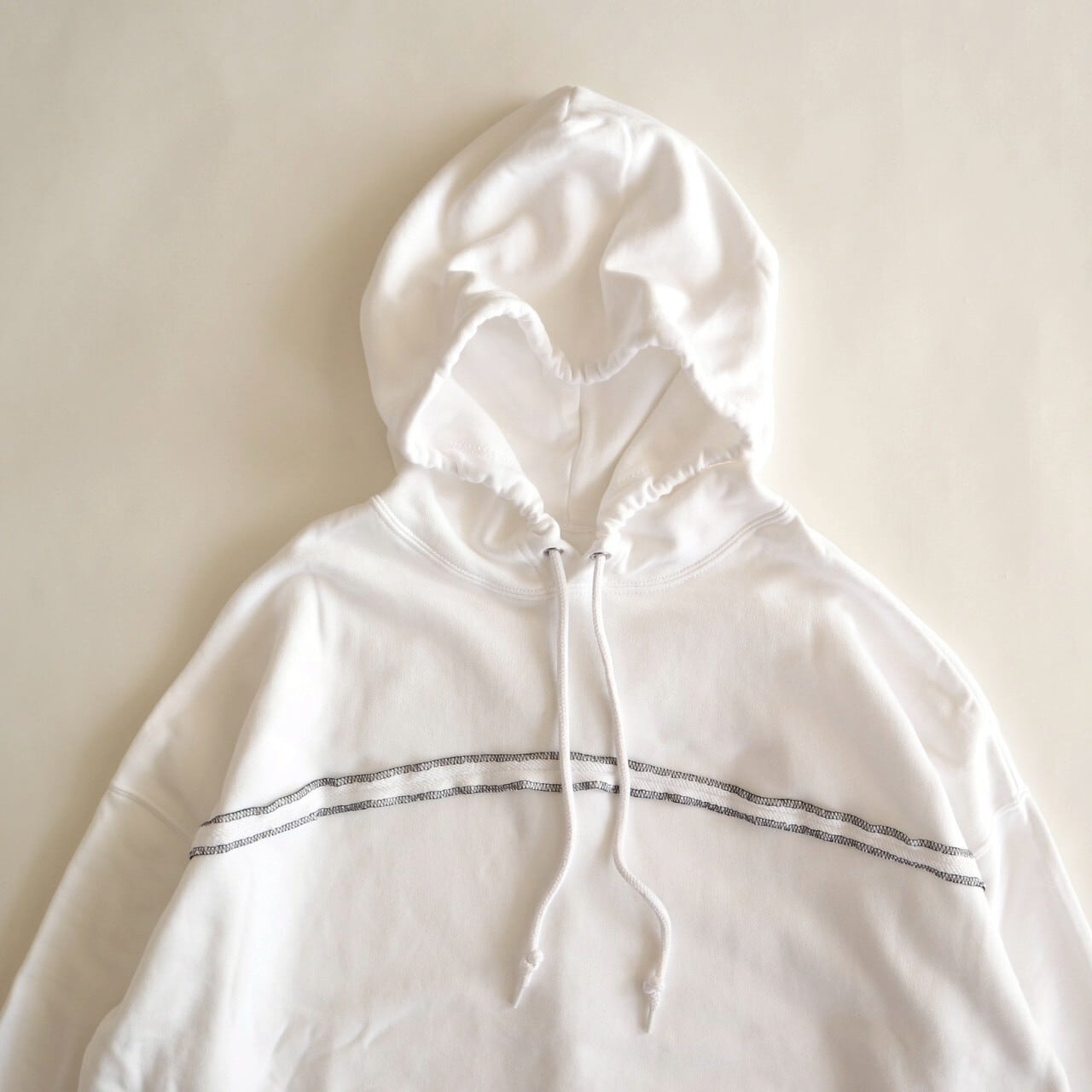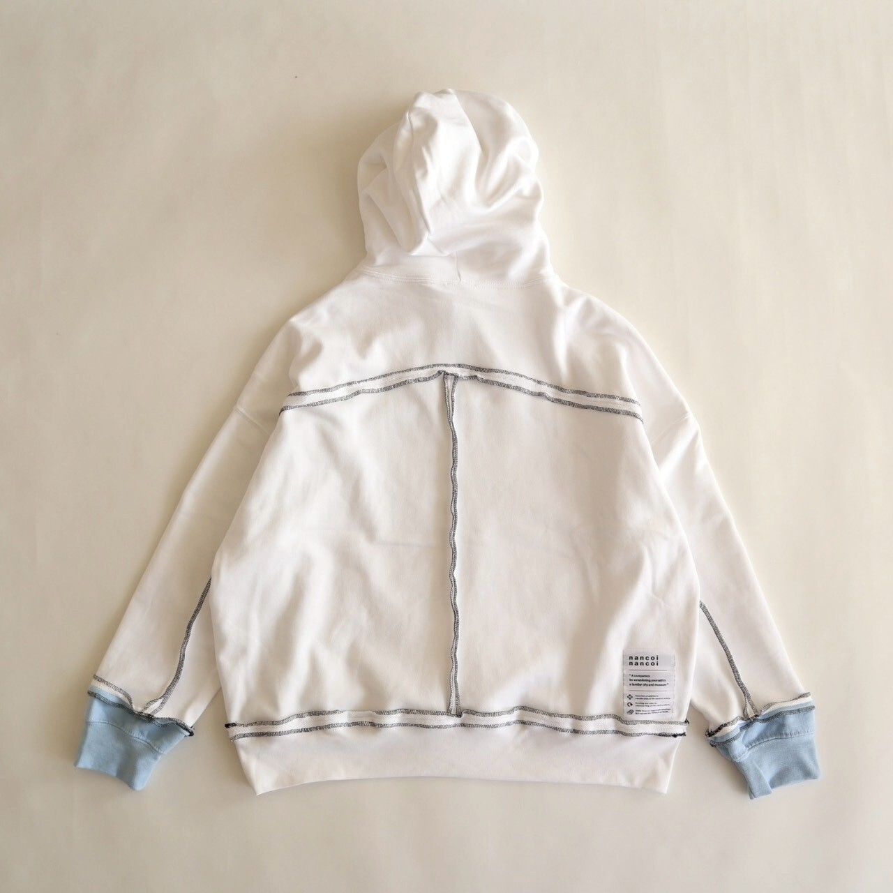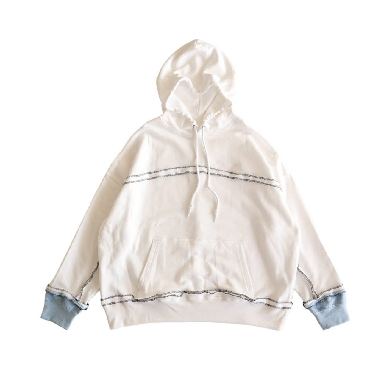 ブラックのステッチと水色の袖リブが特徴的なプルオーバーパーカーです。