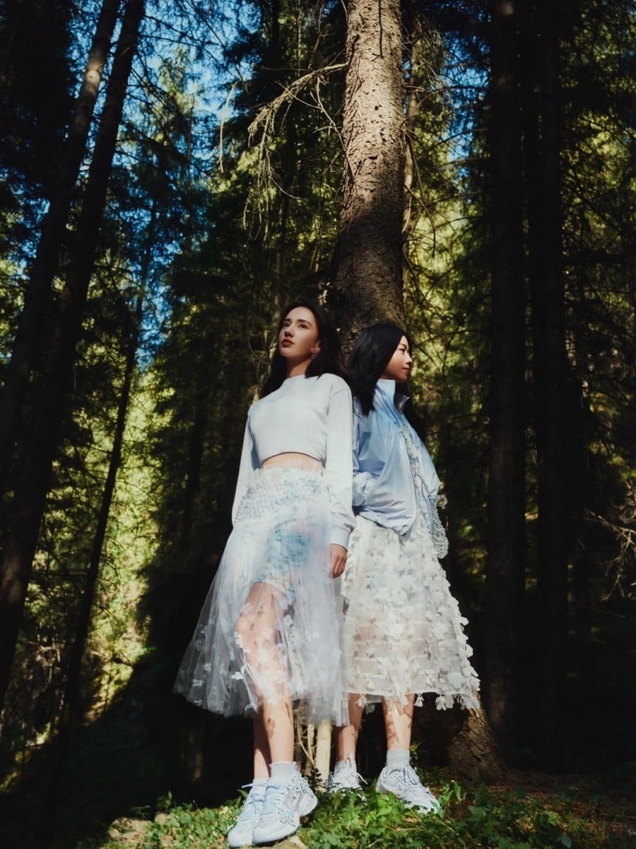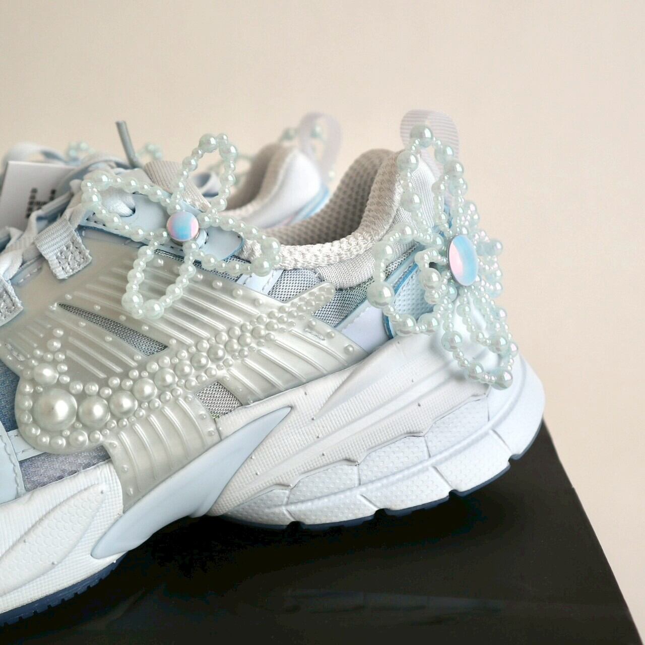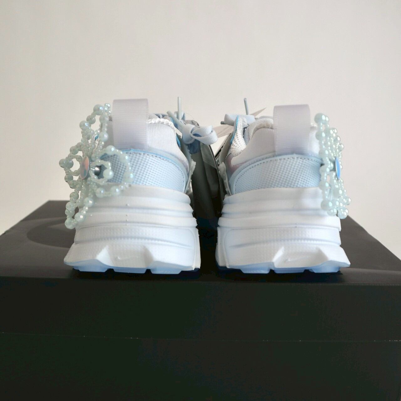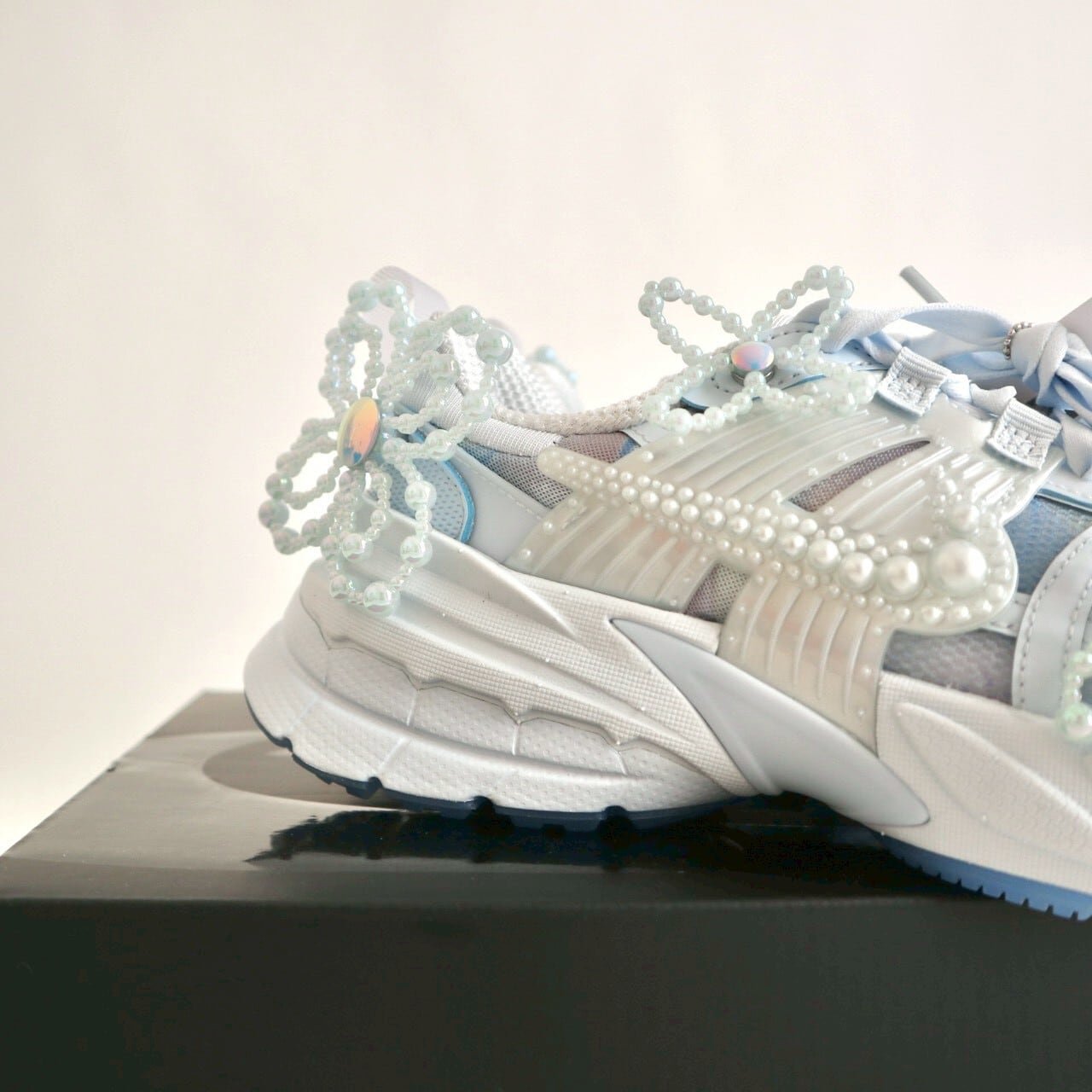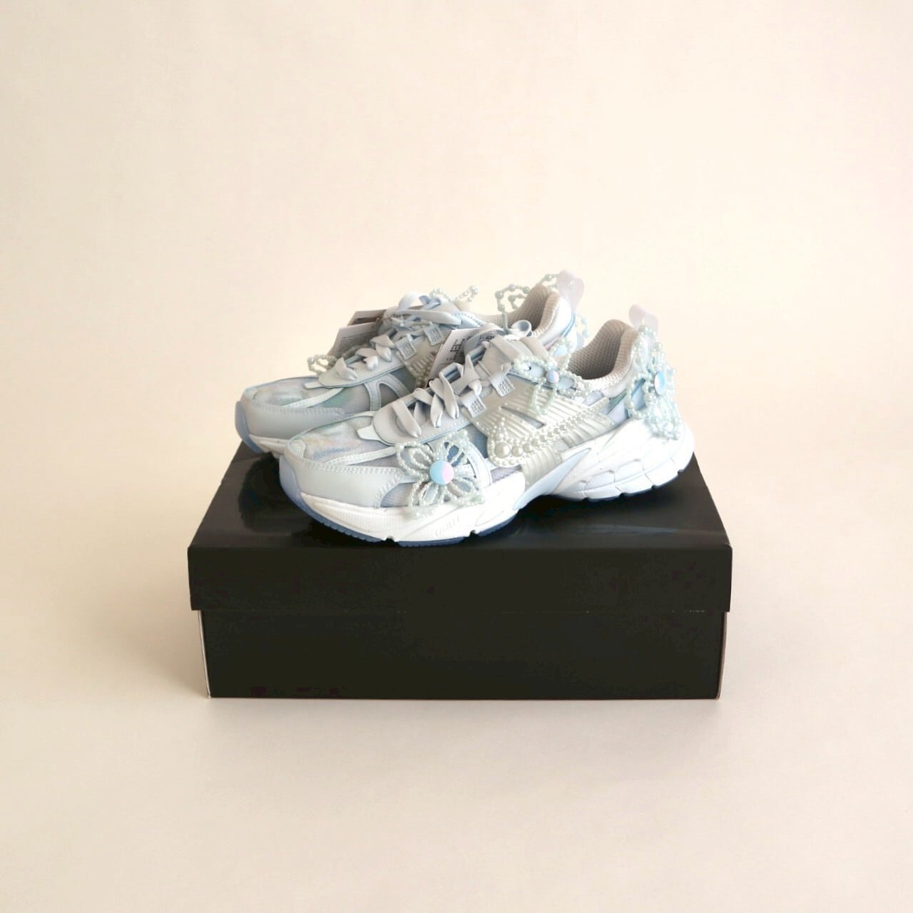 今回のコラボレーションでは、ナイキの象徴的シューズ『V2K Run(V2K ラン)』をベースに採用。“至福”をテーマに再解釈し、アクセサリーやアパレルの要素と融合させたデザインは、淡いブルーティントの色合いに溶け込み、レースのディテールやリボンシューレースなどがフェミニンな雰囲気を醸し出す。自然的な言語で、動き続ける女性の力強さと美しさと出会う場所を表現した。