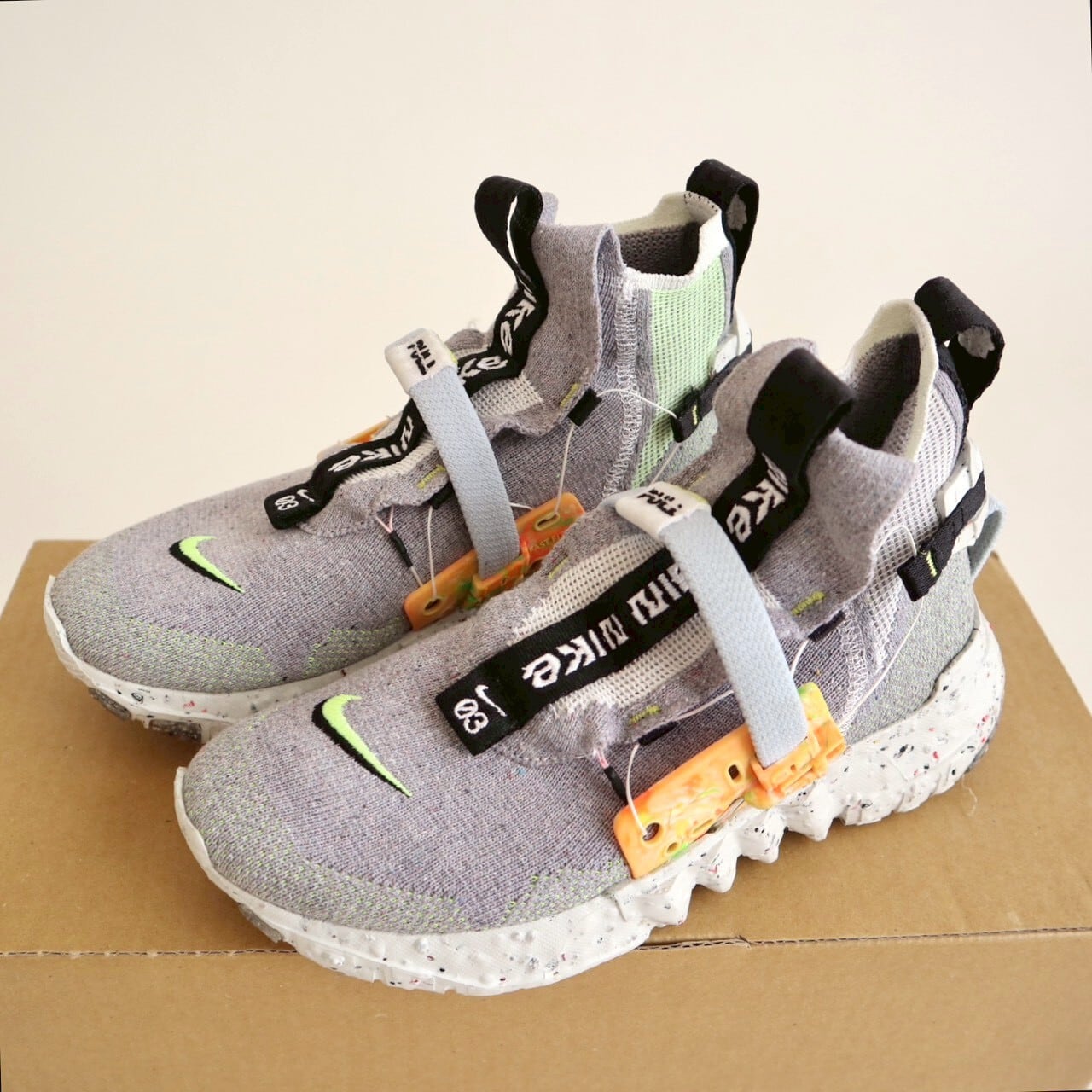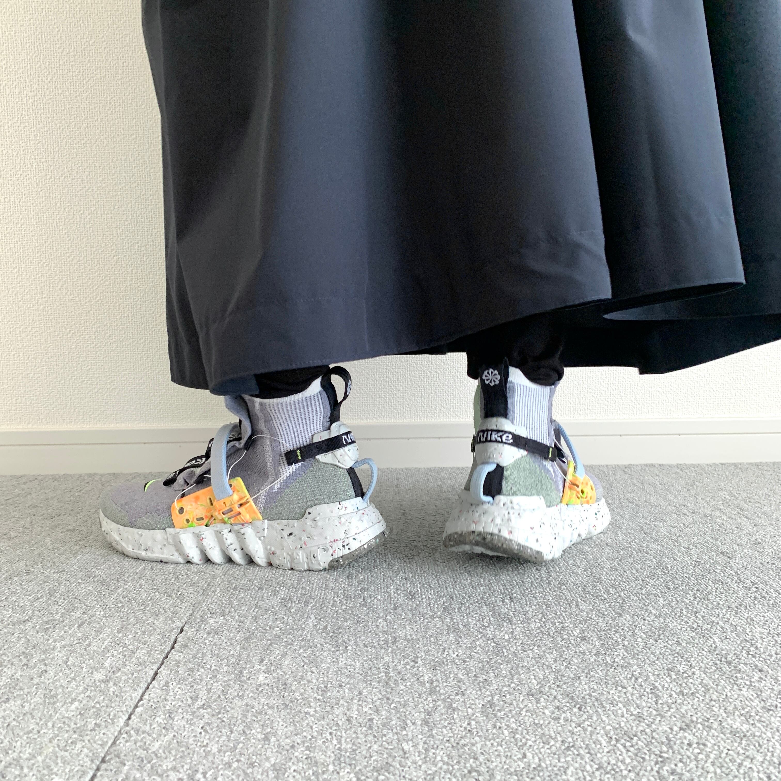 ナイキがサスティナブルを全面に意識したコレクションとして発表されたスペースヒッピーですが、僕的には単純にそのルックスがカッコよくて好きです。このシューズは半分くらいを再利用の素材で作られています。ナイキはこのシューズを「ゴミです」と広告したのも話題になりましたね。私たちも布のハギレを巾着バッグにしたり服の付属部分で使用しますが、SDGsというより、そうした方が可愛くなるからしています。