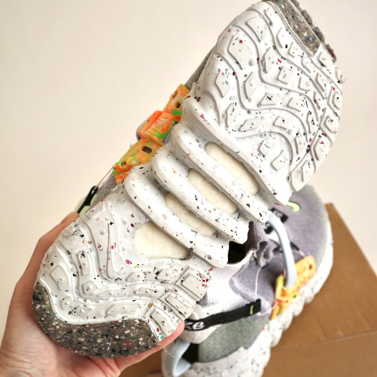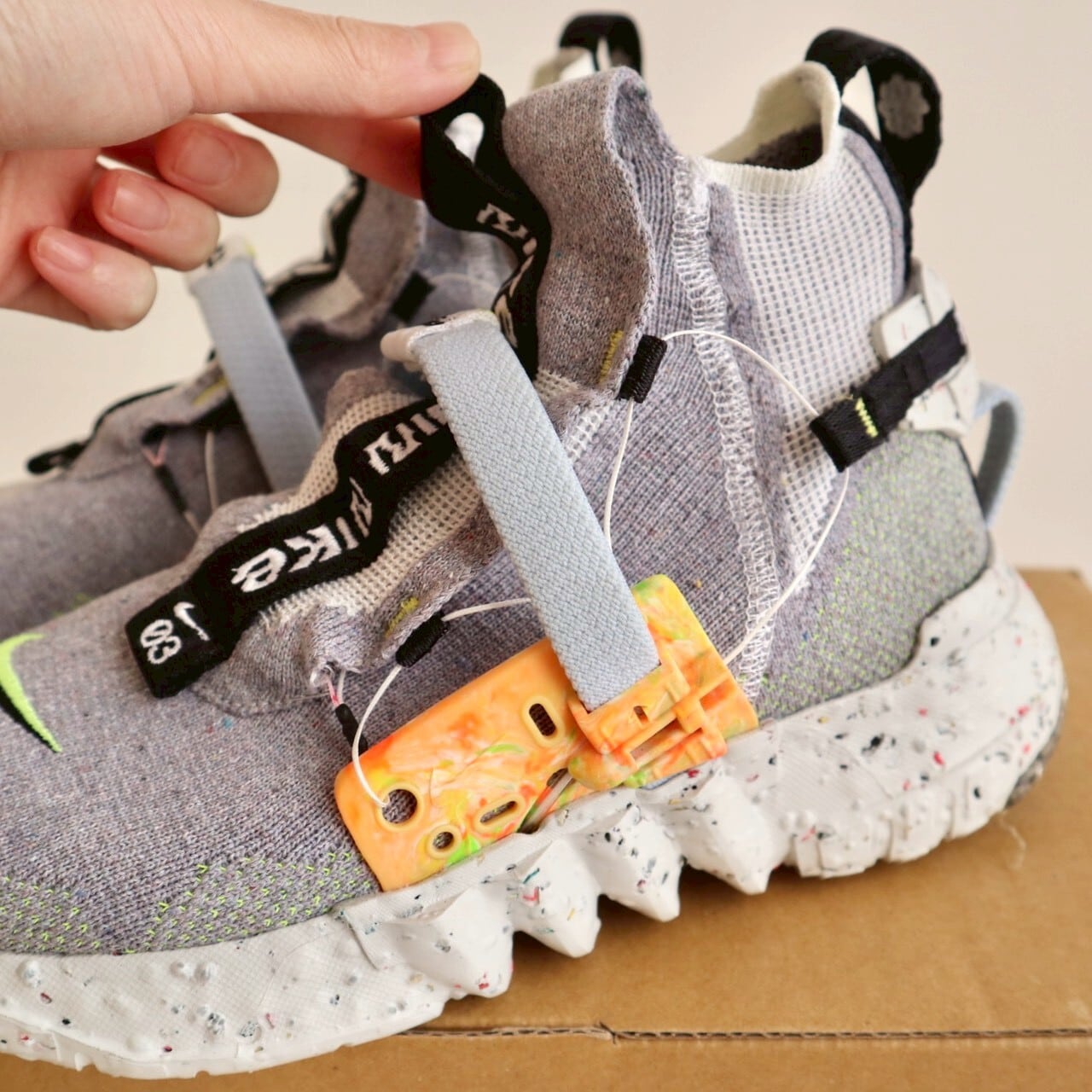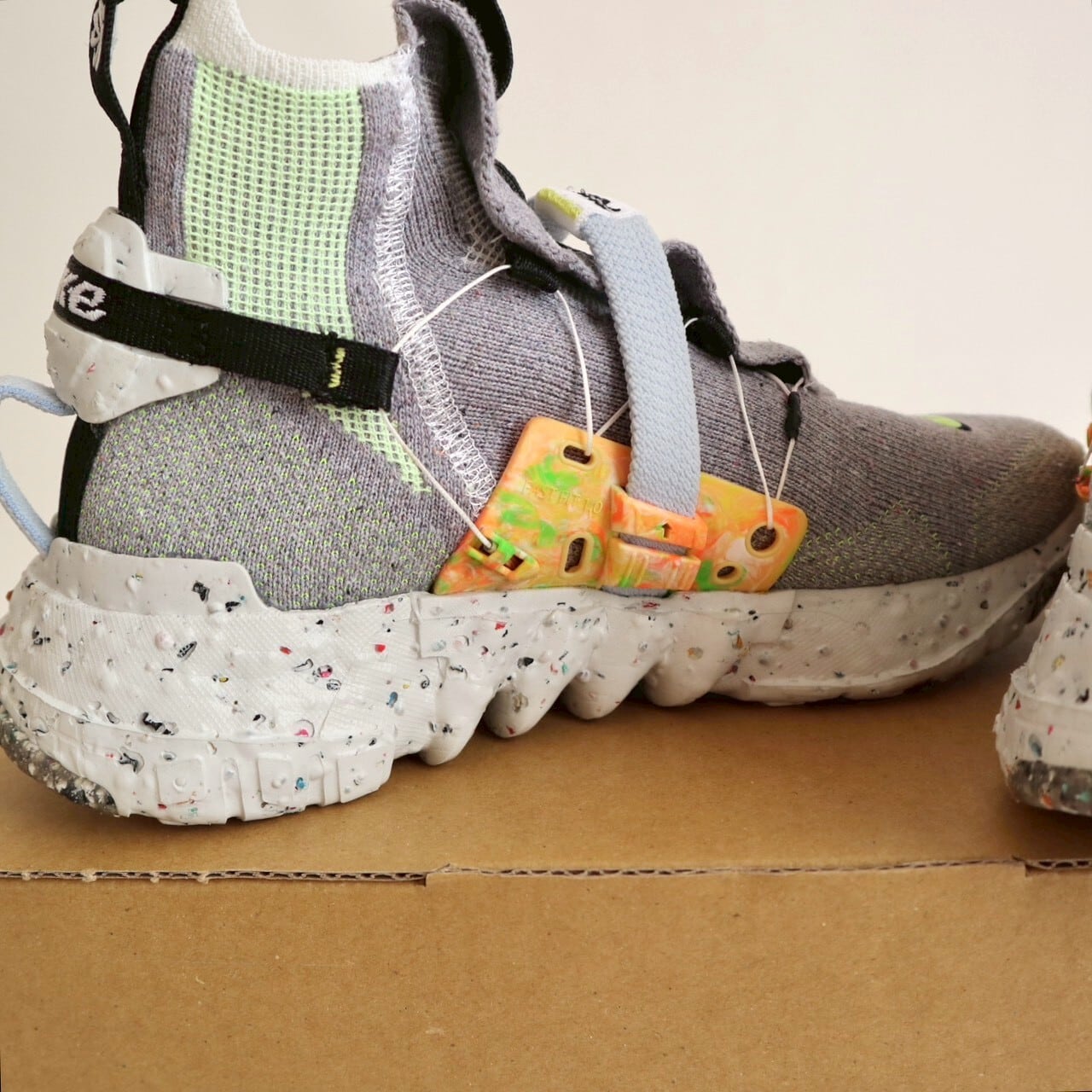 「Space Waste Yarn(宇宙ごみの糸)」と呼ばれるアッパーには、ペットボトル、Tシャツ、糸の廃棄物から生まれたリサイクルポリエステル素材を約85%使用。また、足にぴったりフィットするFastFitシステムの余り部分を使い、着脱を簡単にしている。柔らかいCrater Foamミッドソールには、Nike Grindと複数のフォームの混合物をミックス。優れた安定感を持つユニークなデザインに仕上げている。インソールには、Nikeのネクスト% ランニングシューズで究極の履き心地を生み出すクッショニング、ZoomXフォームの廃棄物を使用している。