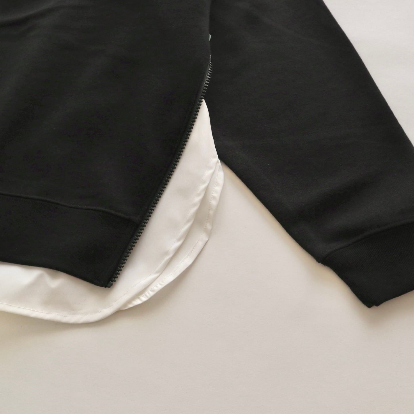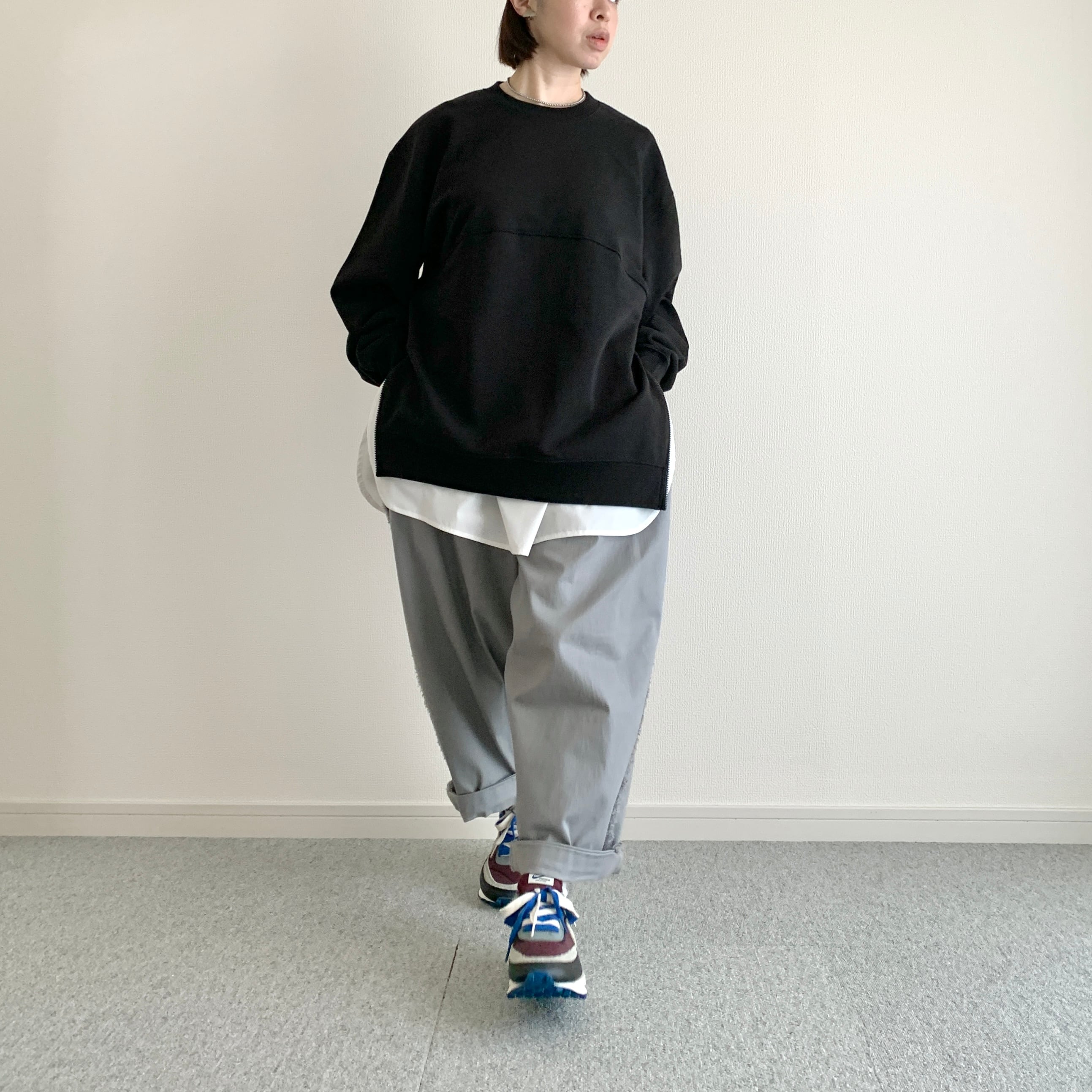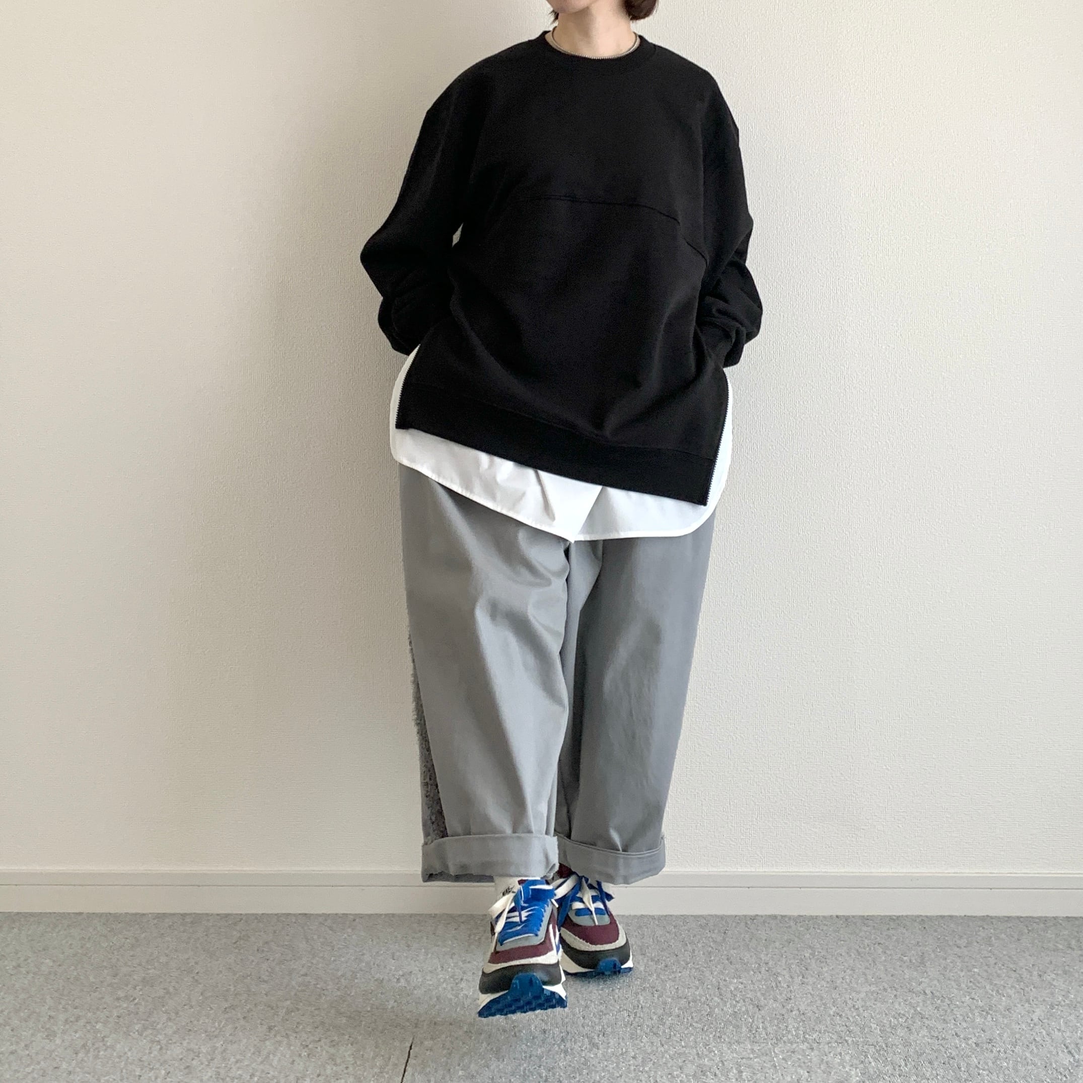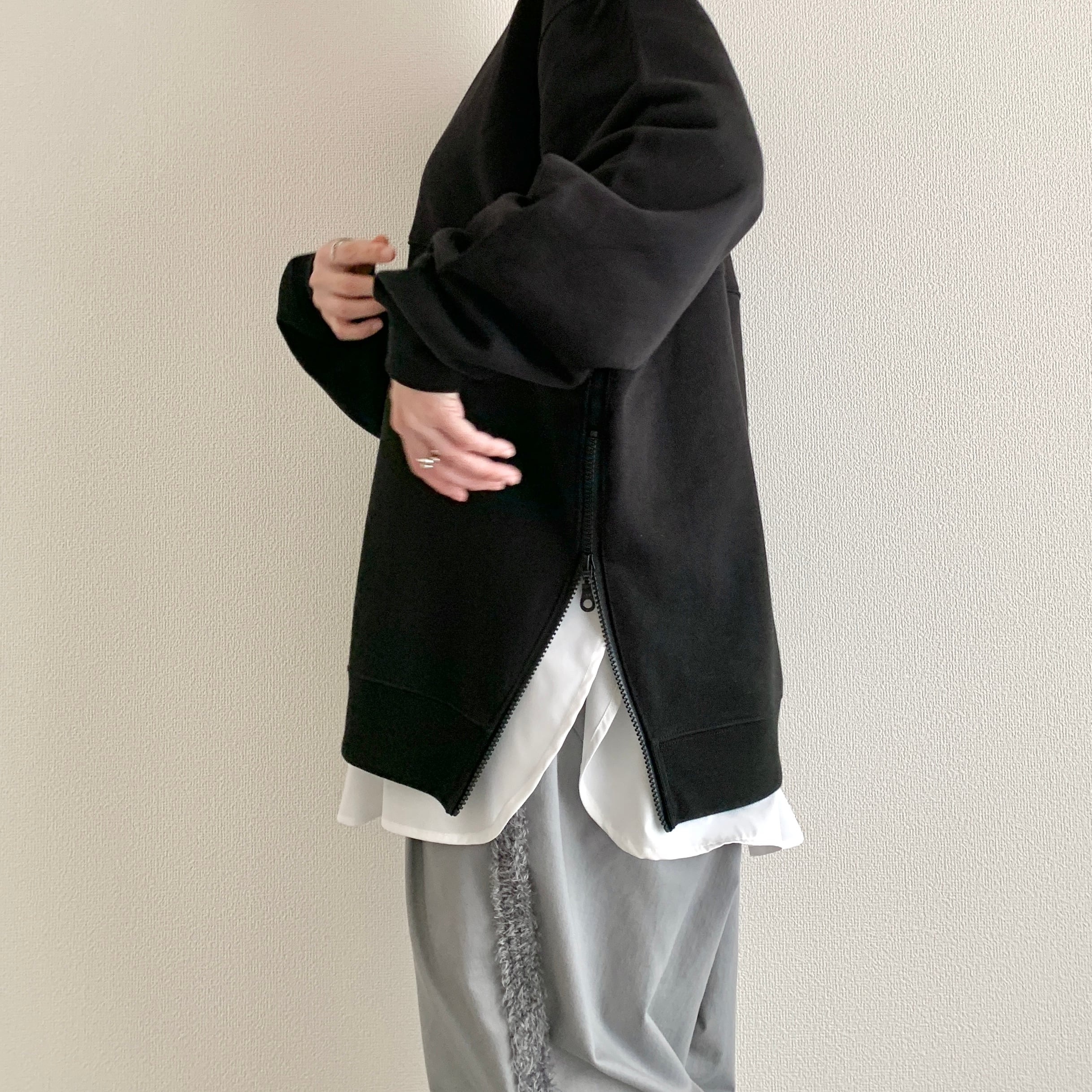 ひろさんに「サイドにファスナーが付いているスウェット作りましょうよ」って言われて早5年、ようやく形になりました。やってみたら上手くできたので、異素材の生地でシャツのレイヤードっぽく作ってみました。