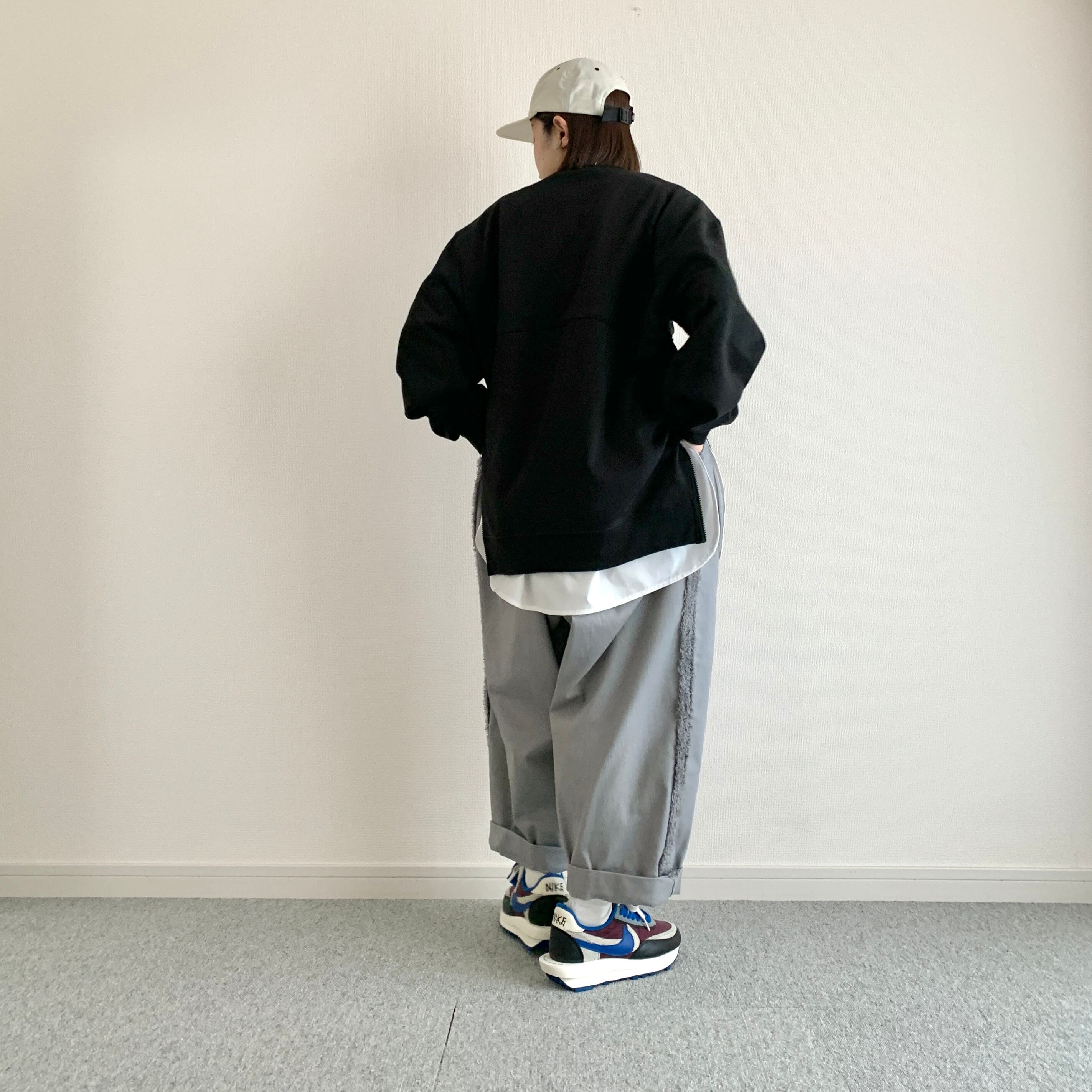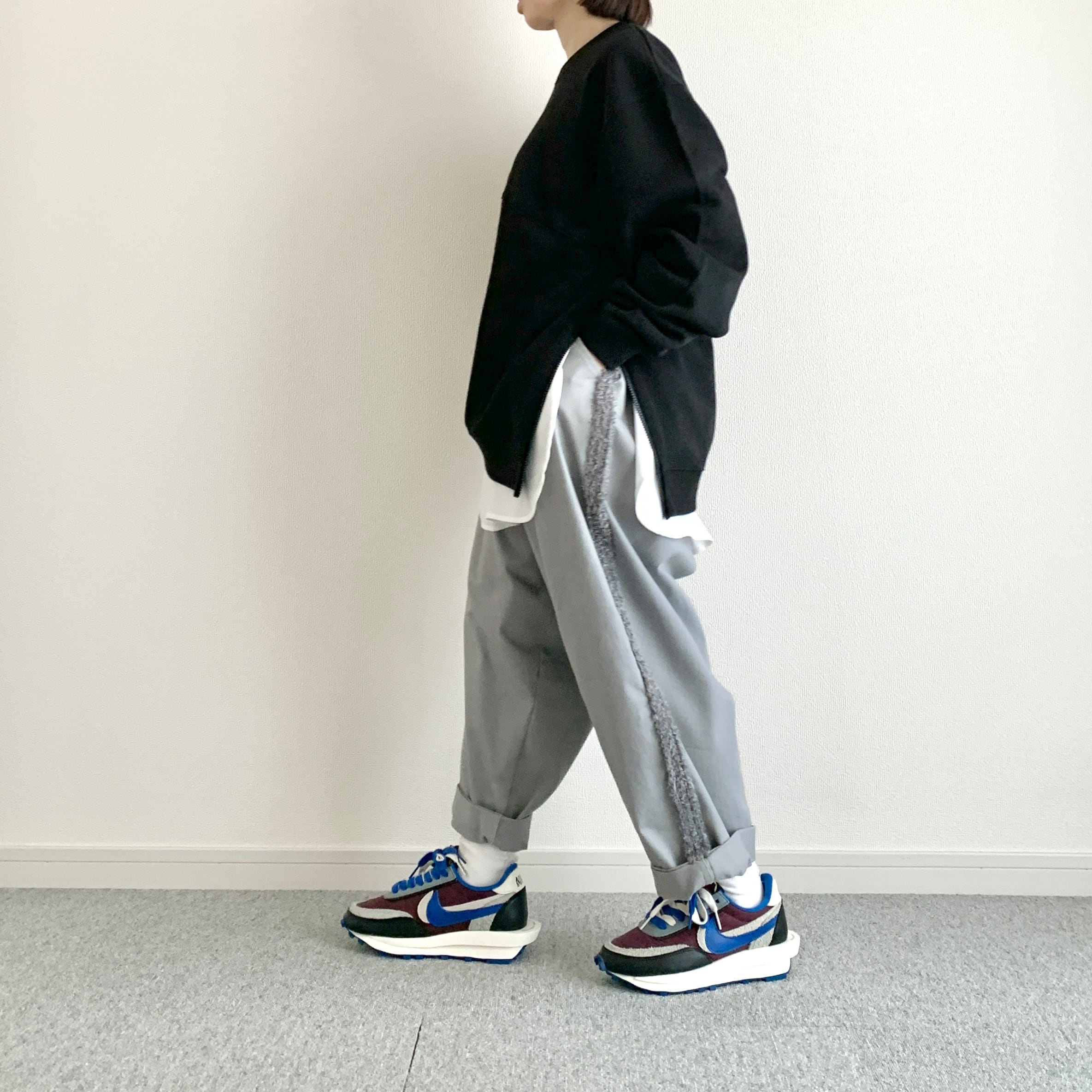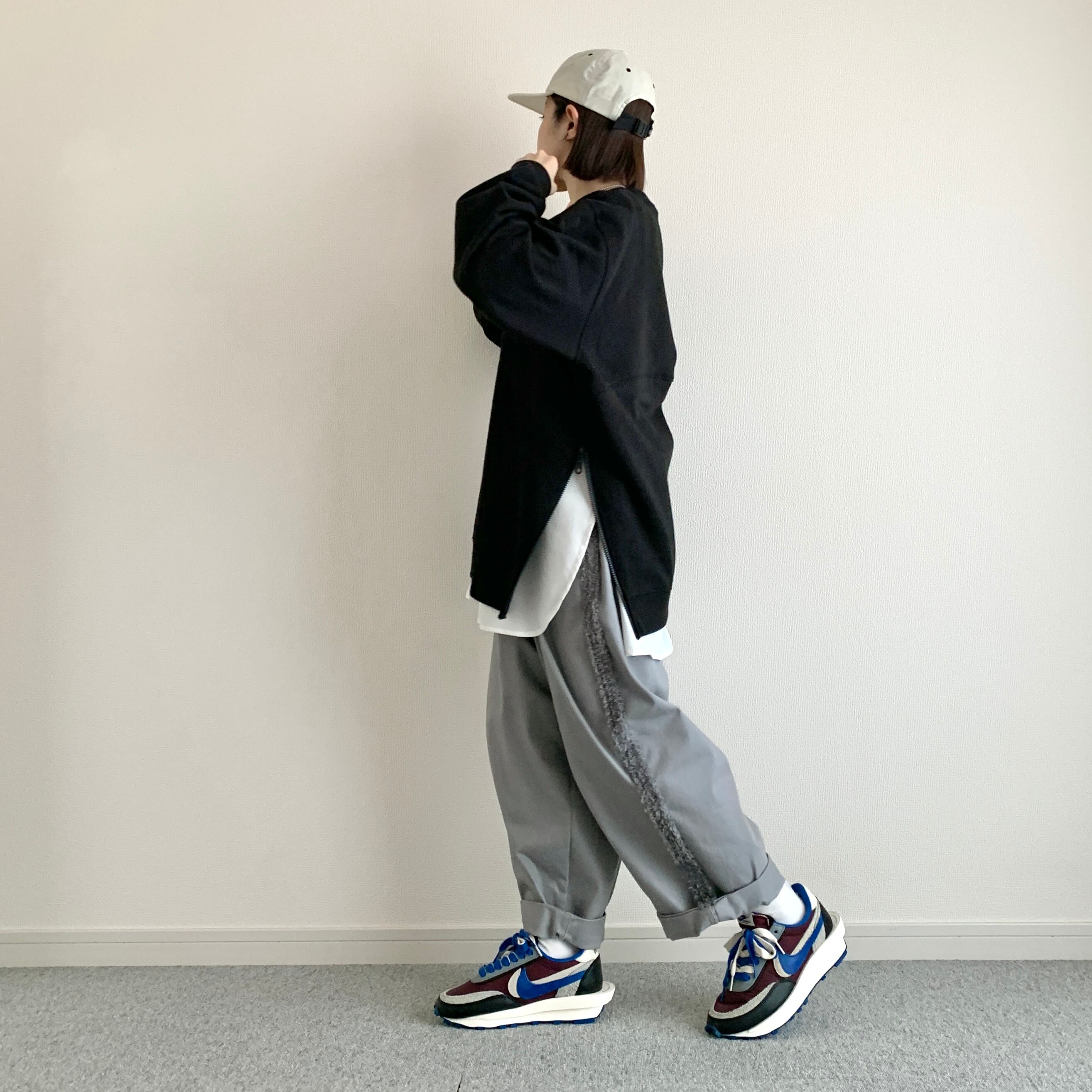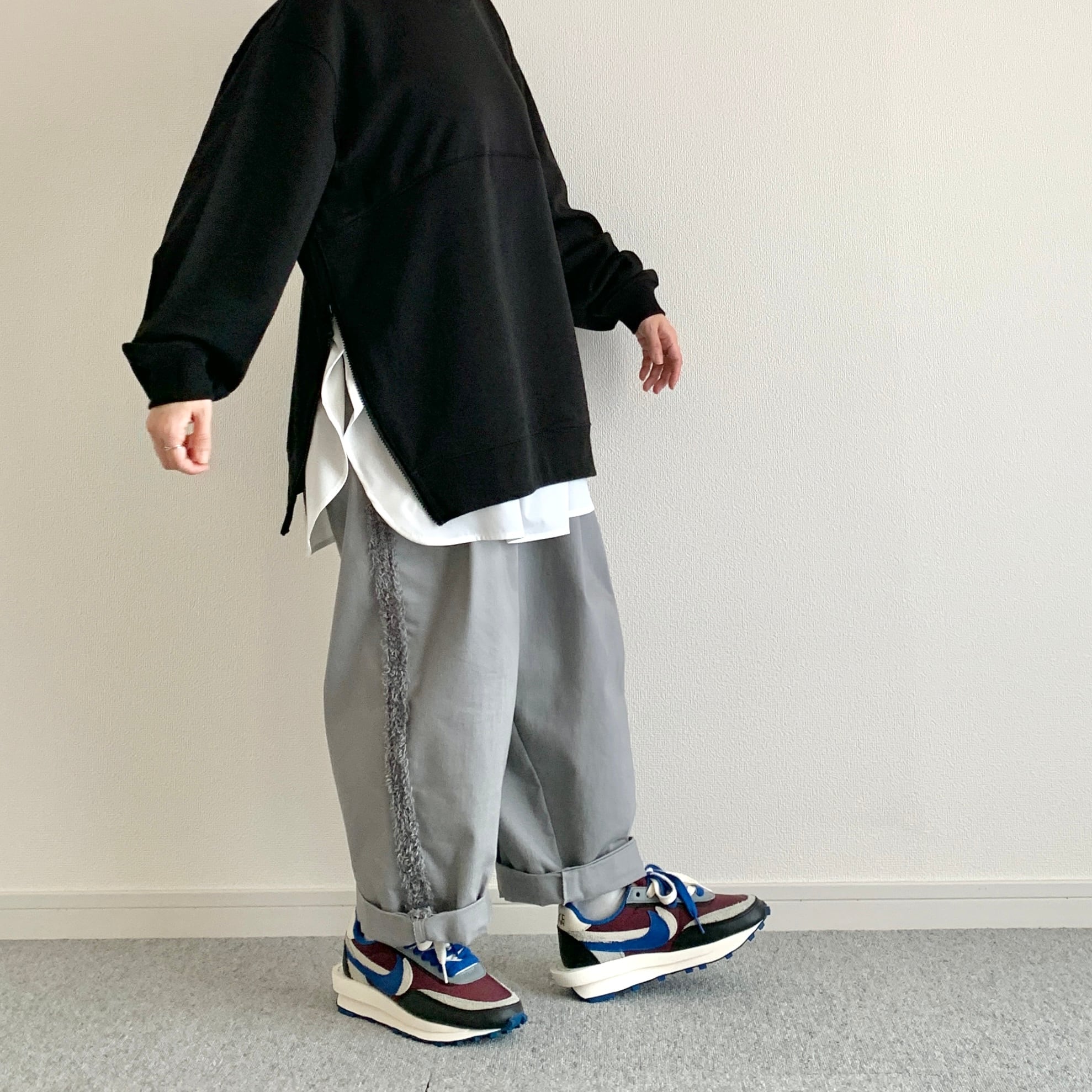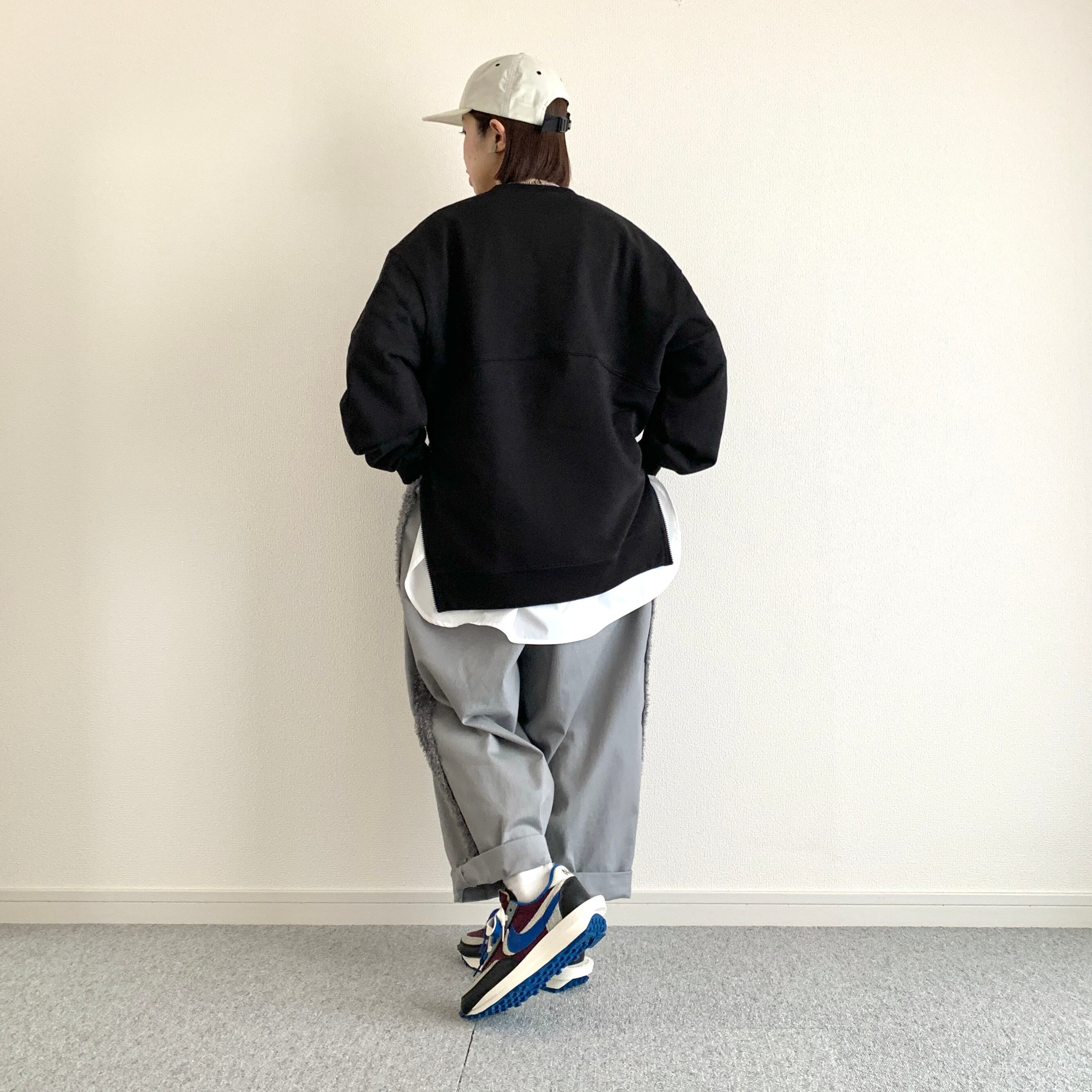ひろさんに「サイドにファスナーが付いているスウェット作りましょうよ」って言われて早5年、ようやく形になりました。やってみたら上手くできたので、異素材の生地でシャツのレイヤードっぽく作ってみました。
