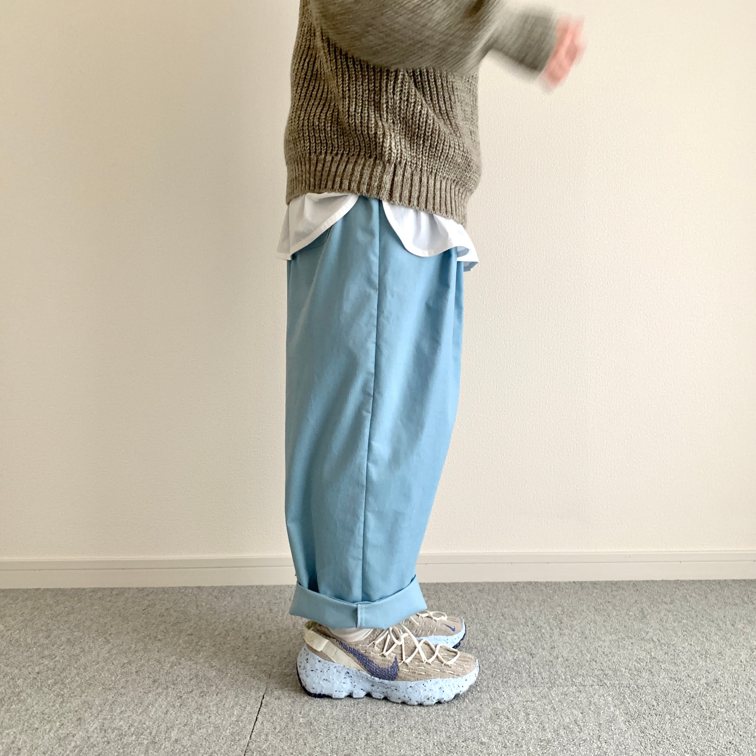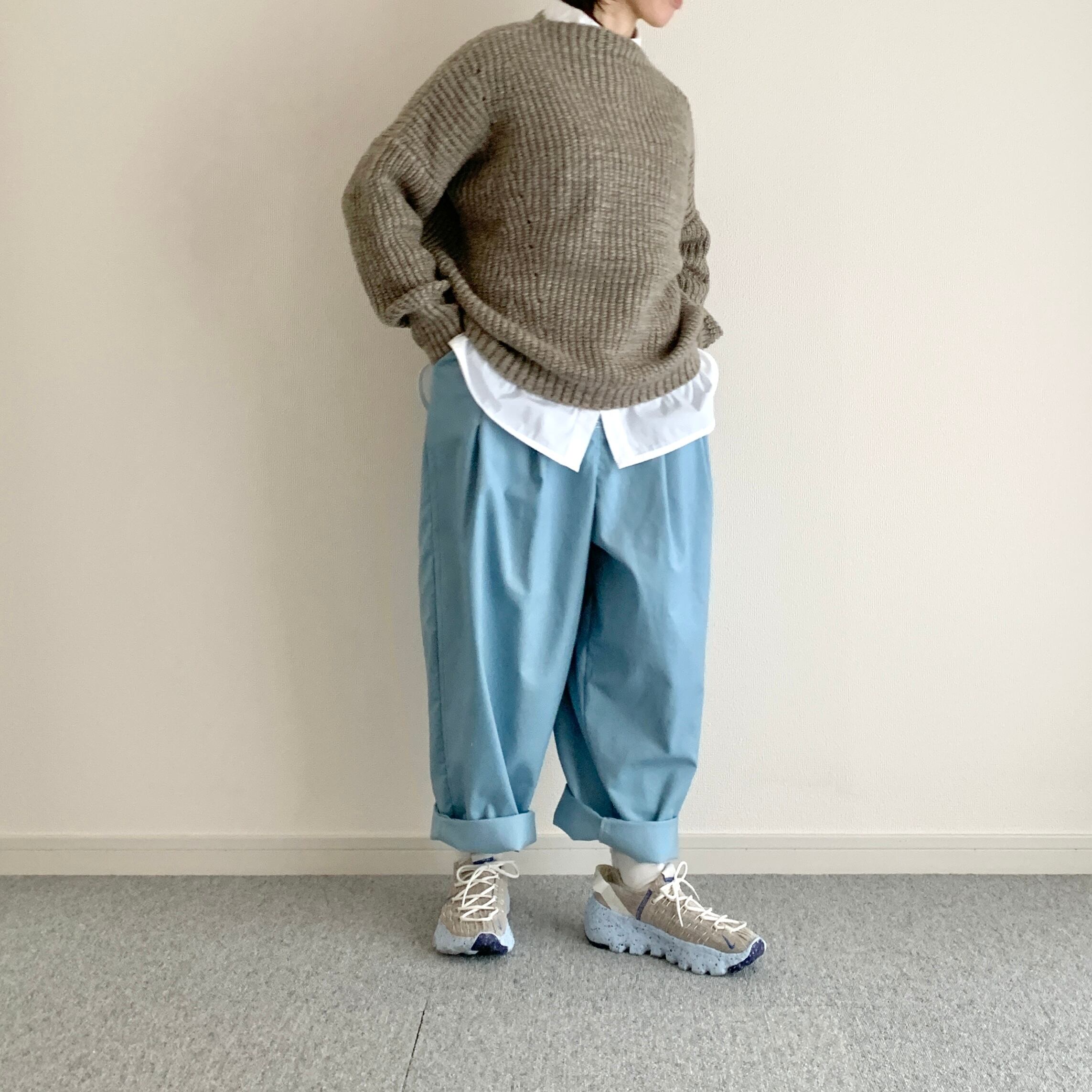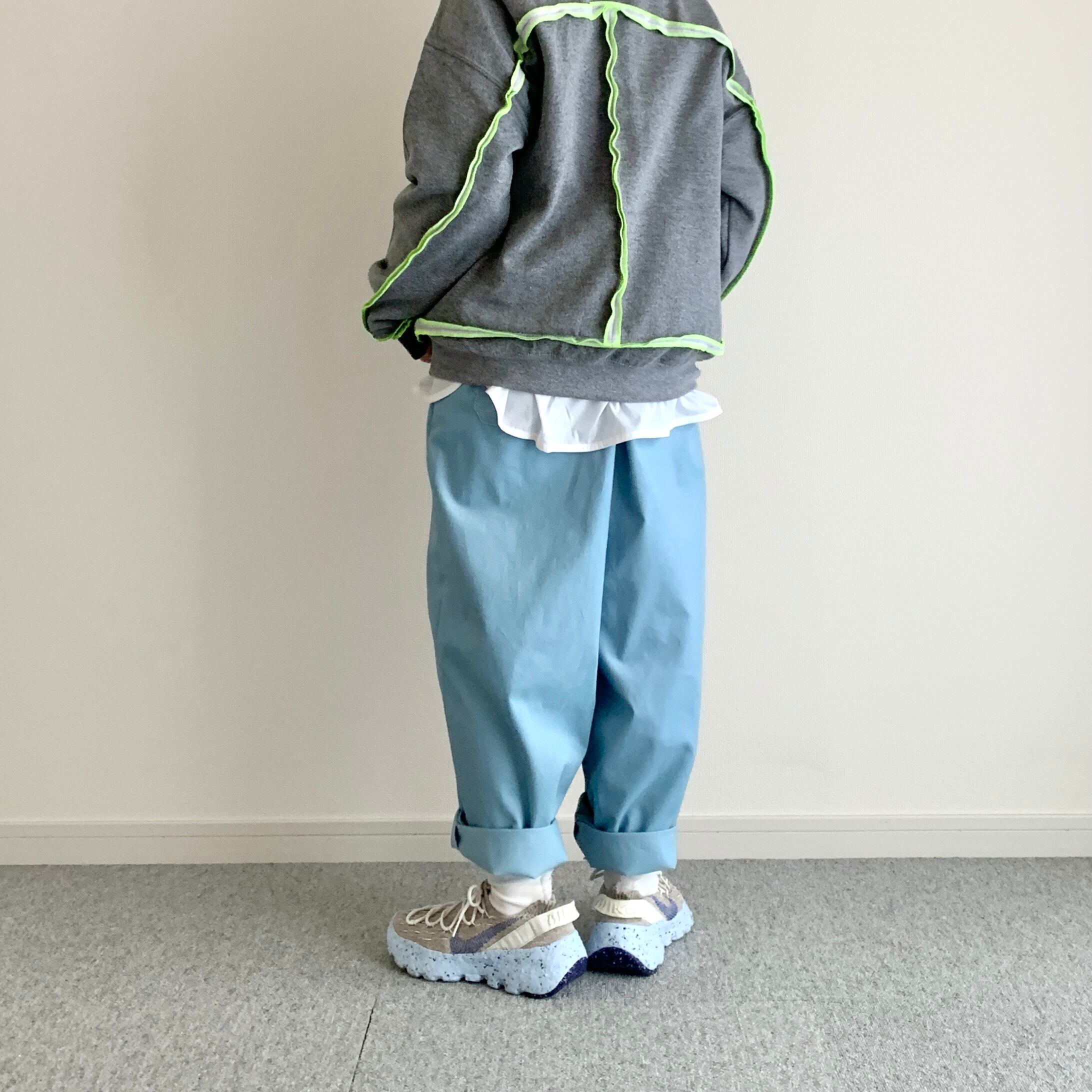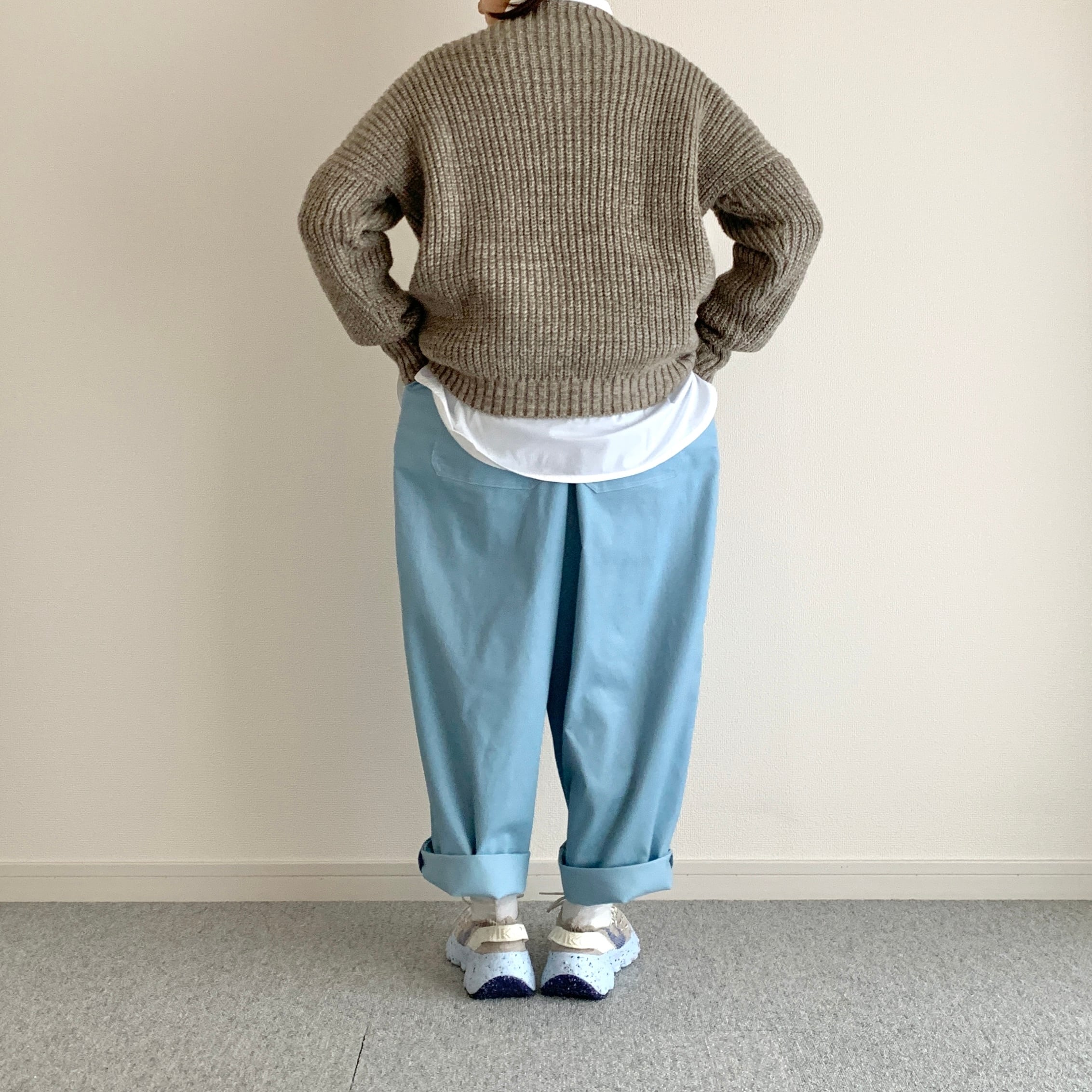 遠目で見るとブルージーンズにも見えるような見えないような、そんな色のパンツです。