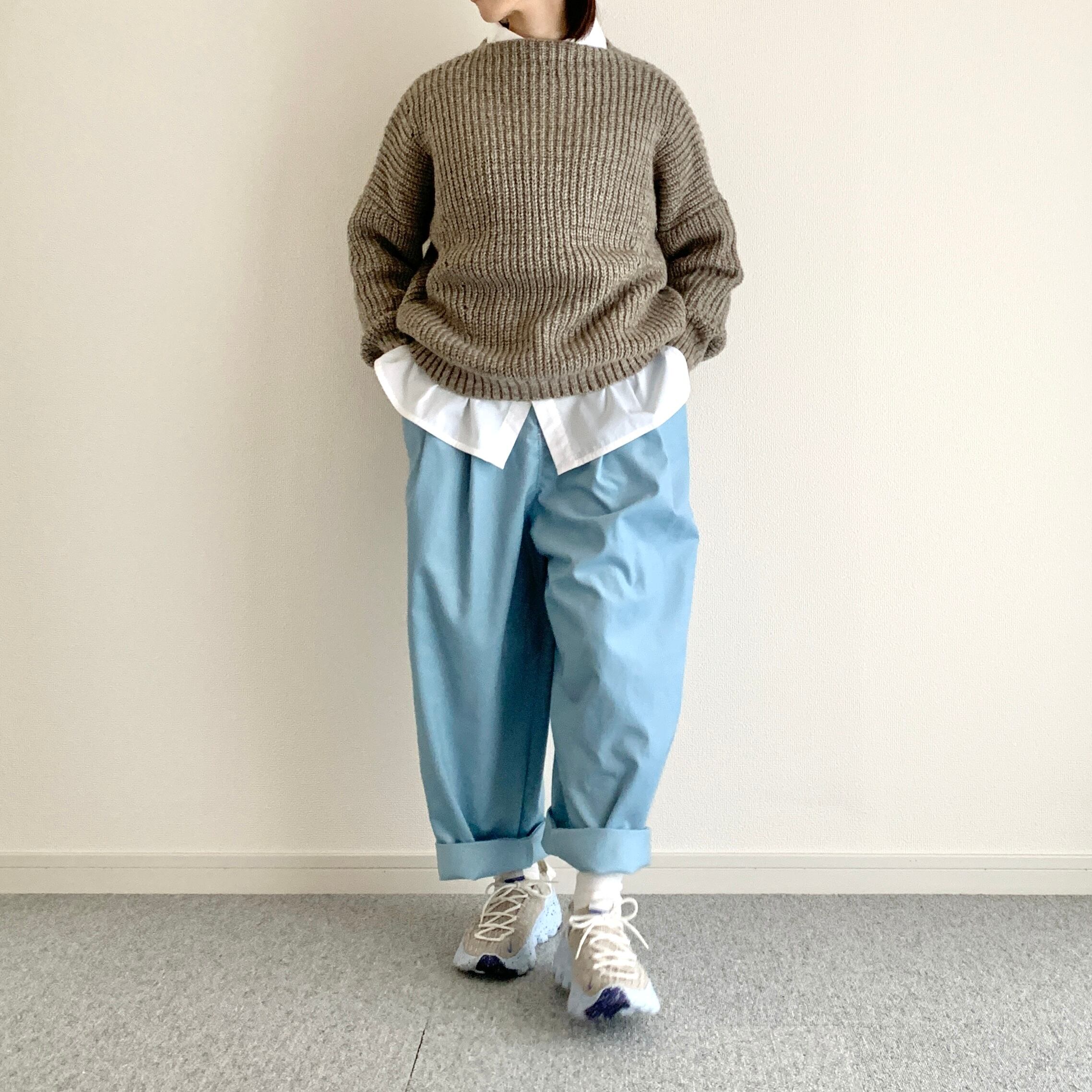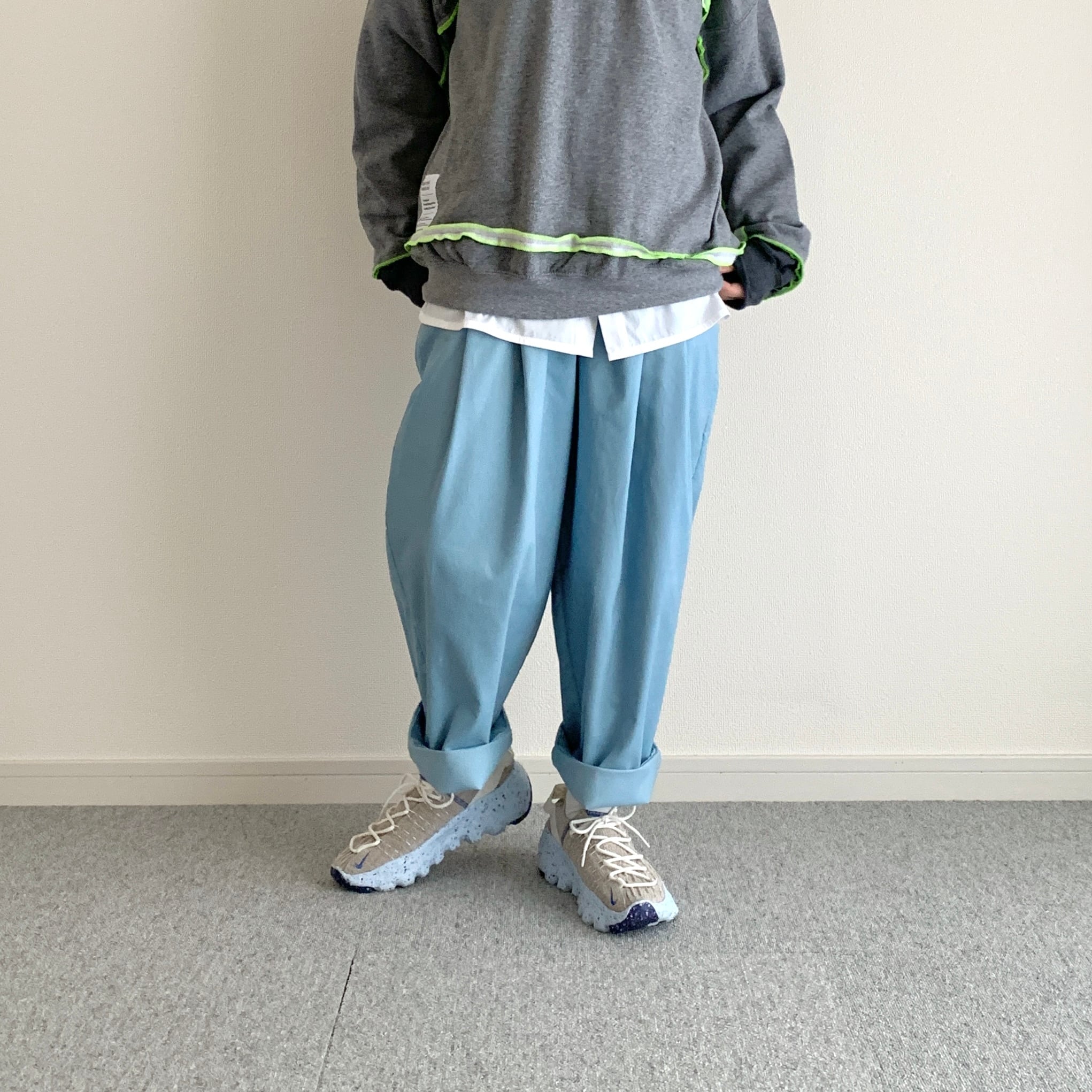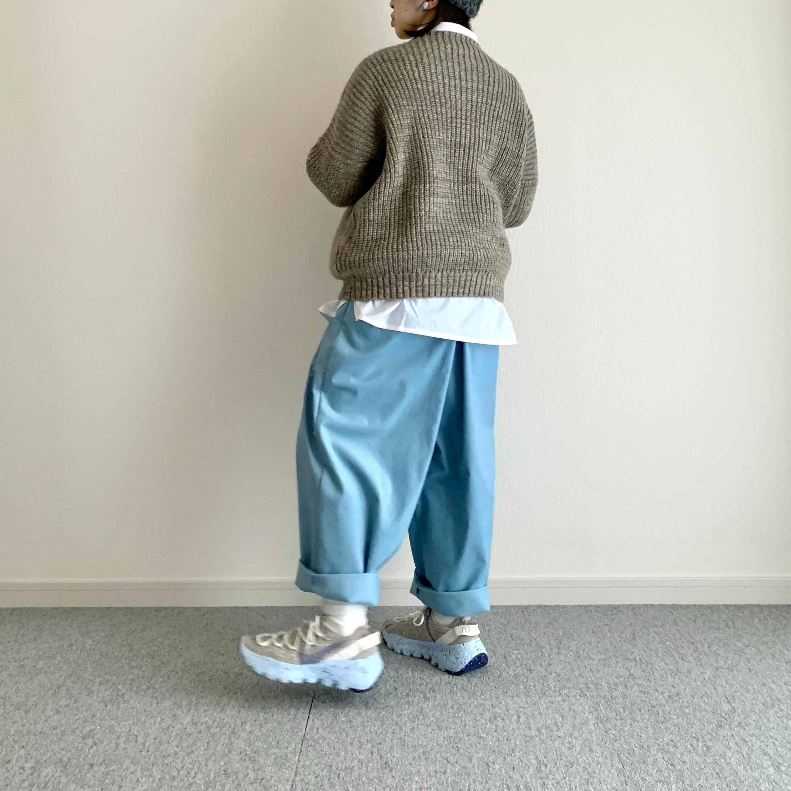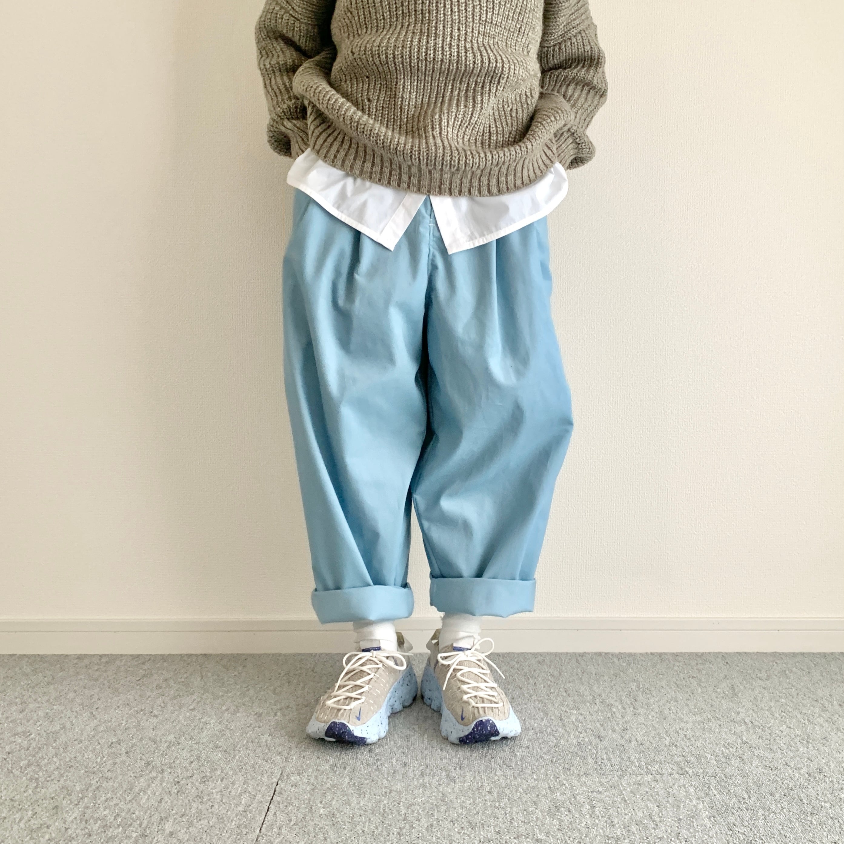 遠目で見るとブルージーンズにも見えるような見えないような、そんな色のパンツです。