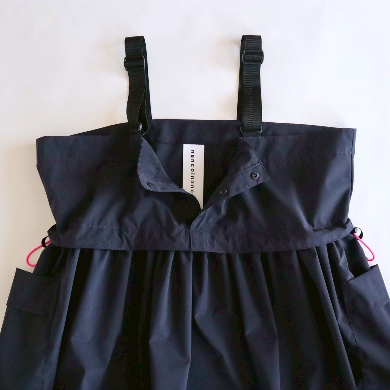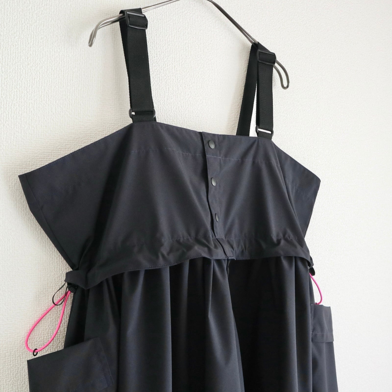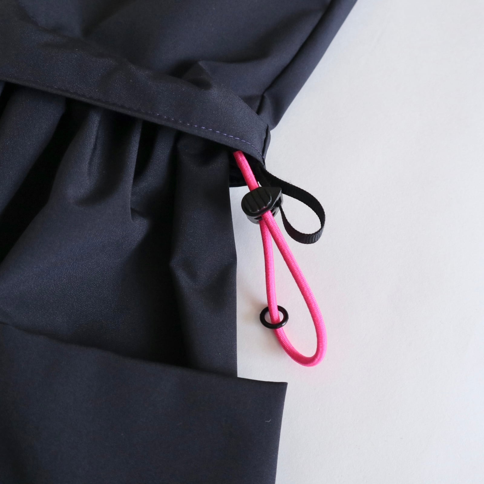 ダークネイビーに蛍光ピンクのコードが効いていて、コードを絞ればシルエットも変化して、コーディネートを楽しめます。