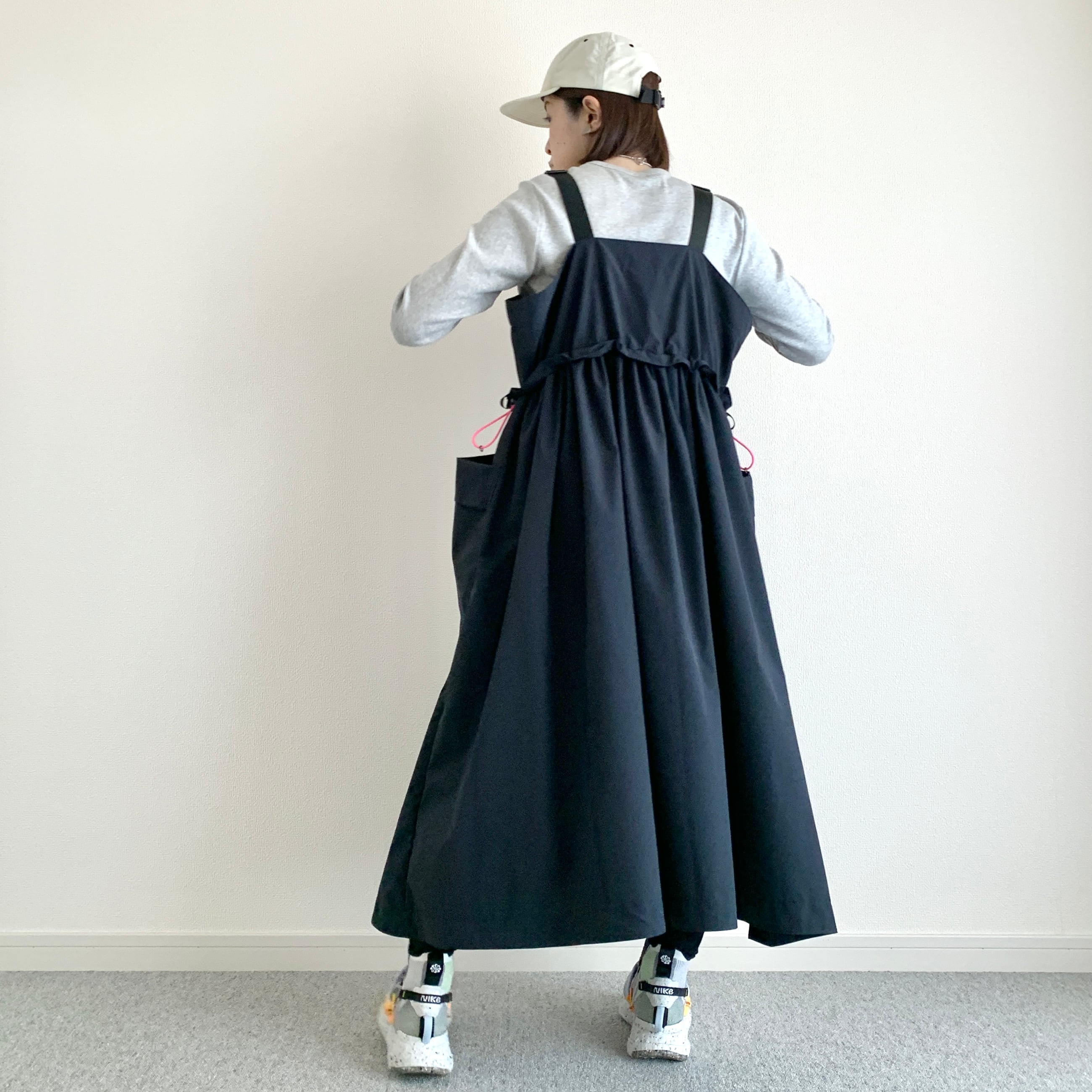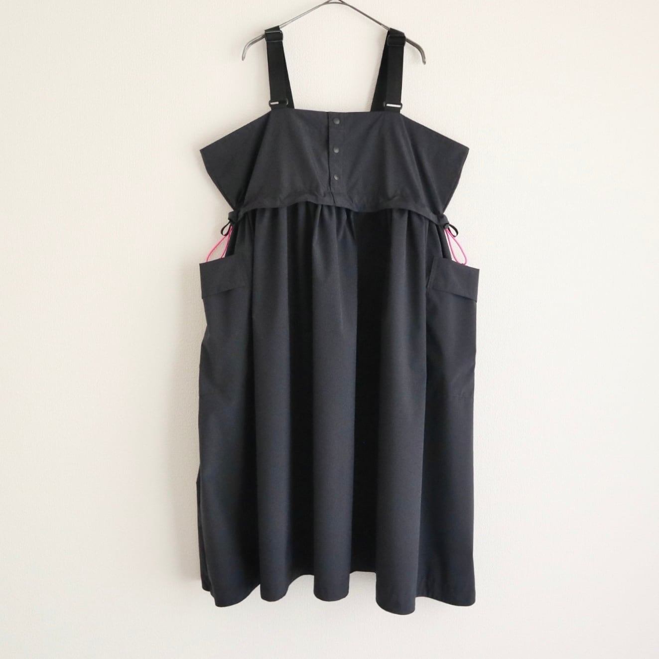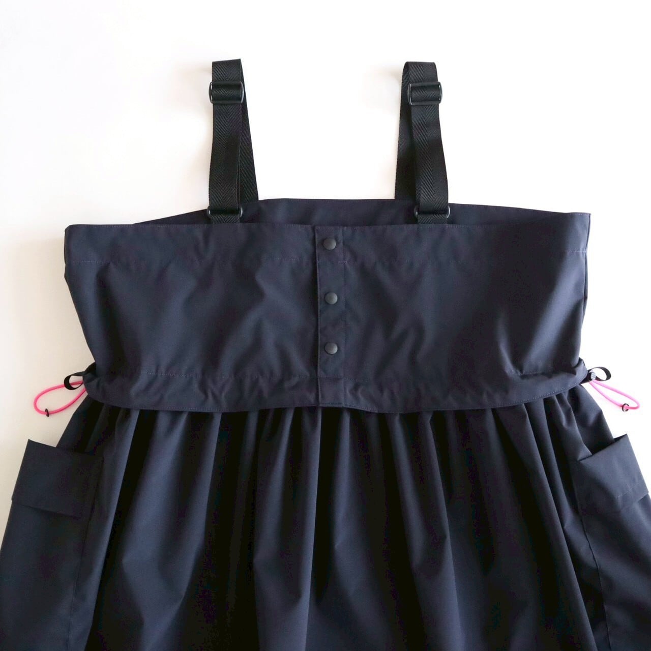 ダークネイビーに蛍光ピンクのコードが効いていて、コードを絞ればシルエットも変化して、コーディネートを楽しめます。
