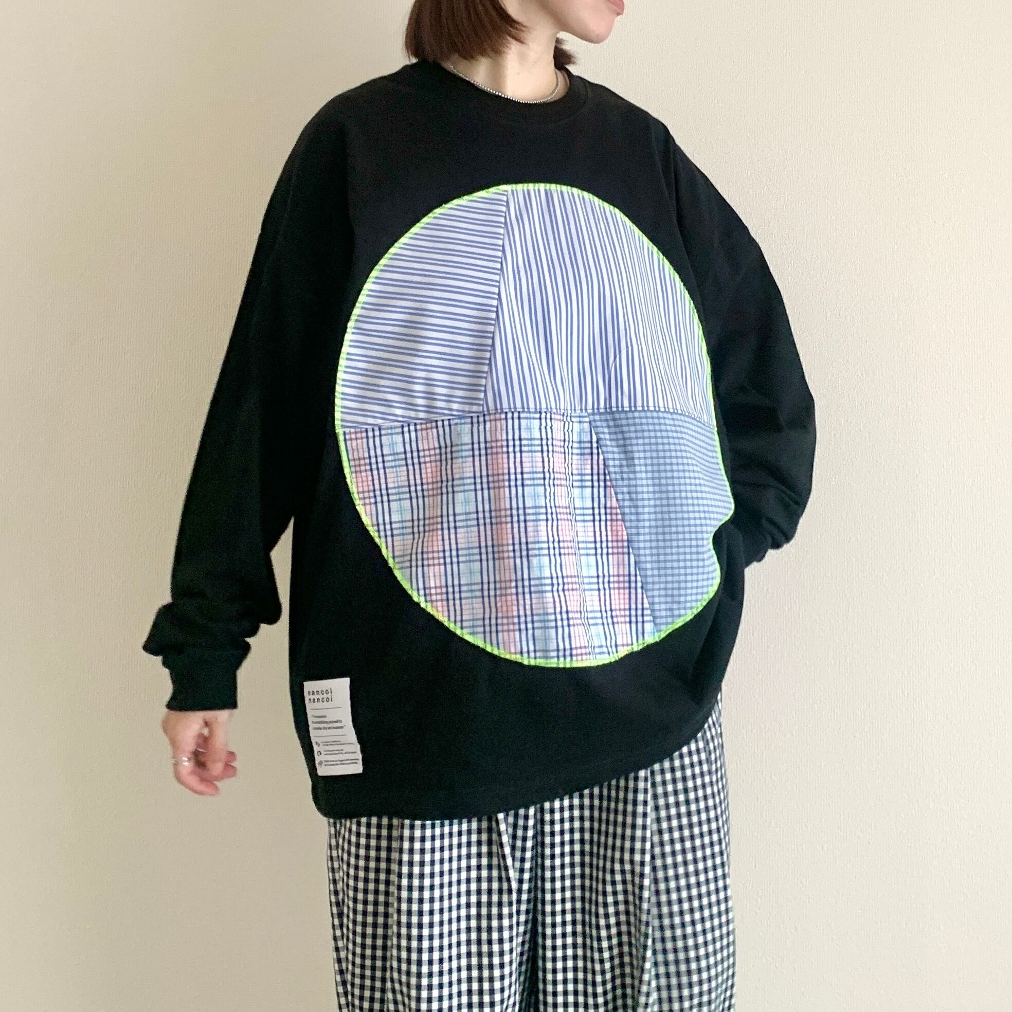 マル部分もツギハギしてクラフト感出てを出し、ロックミシンステッチのネオンカラーをアクセントに。身頃で切り返しをしているのでうしろにも切り返し線が走ってます。