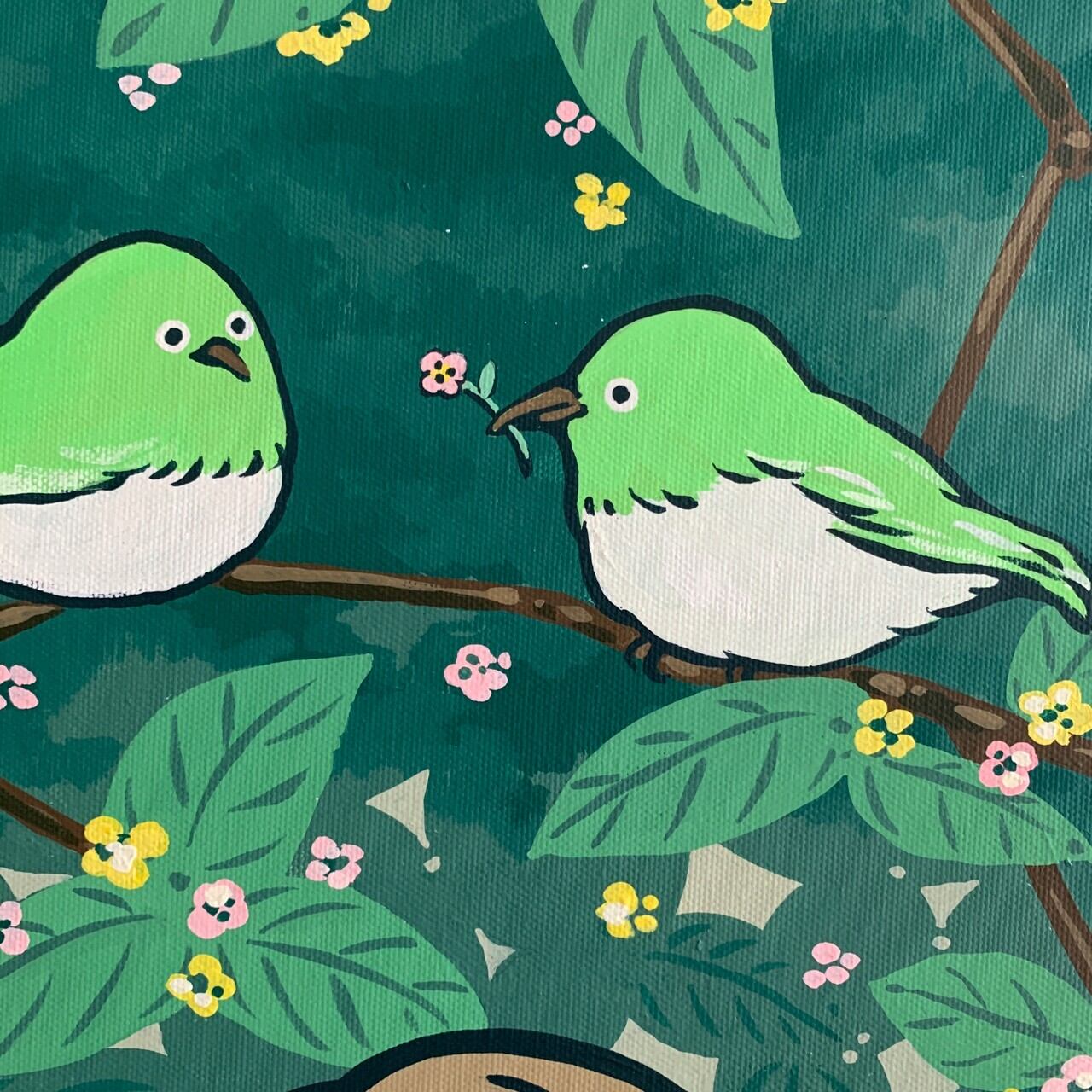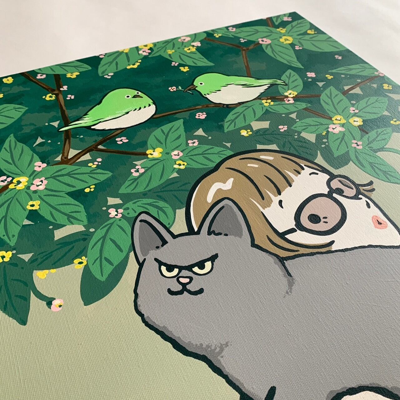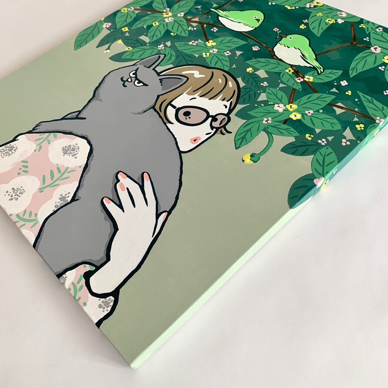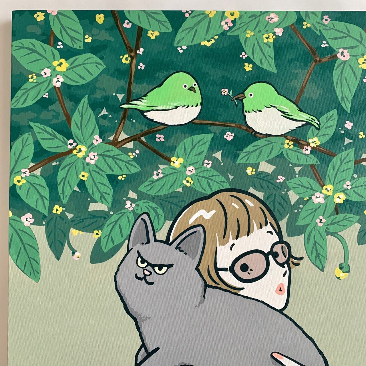 女の子、ねこ、めじろ達の目線を追いかけたくなる作品です