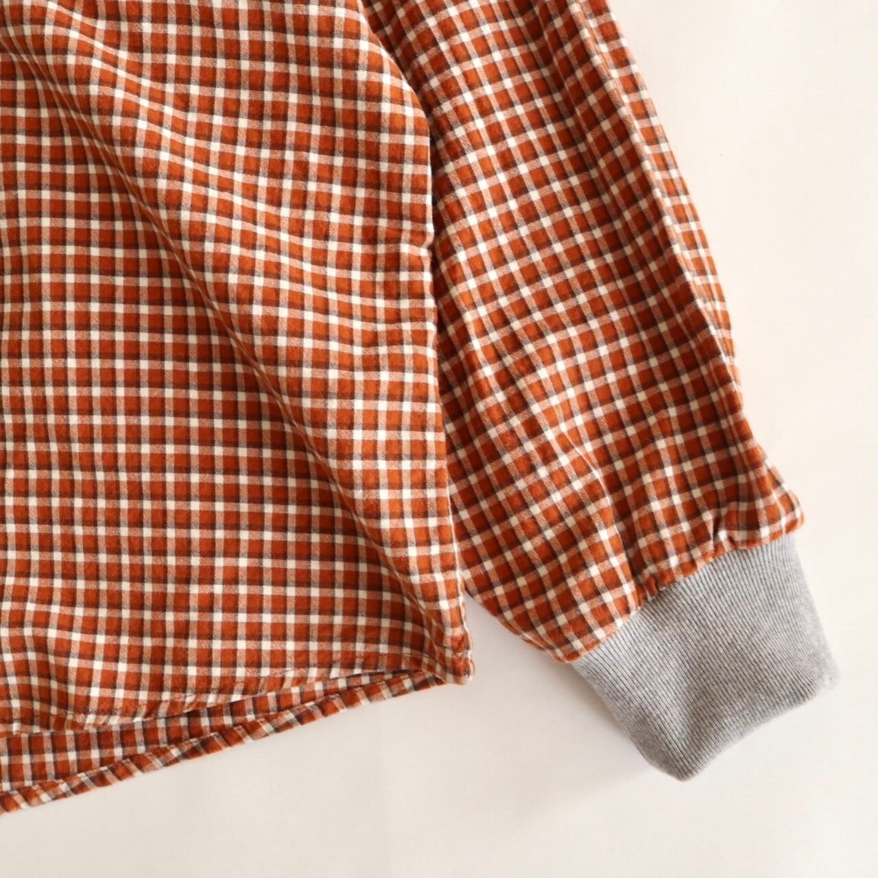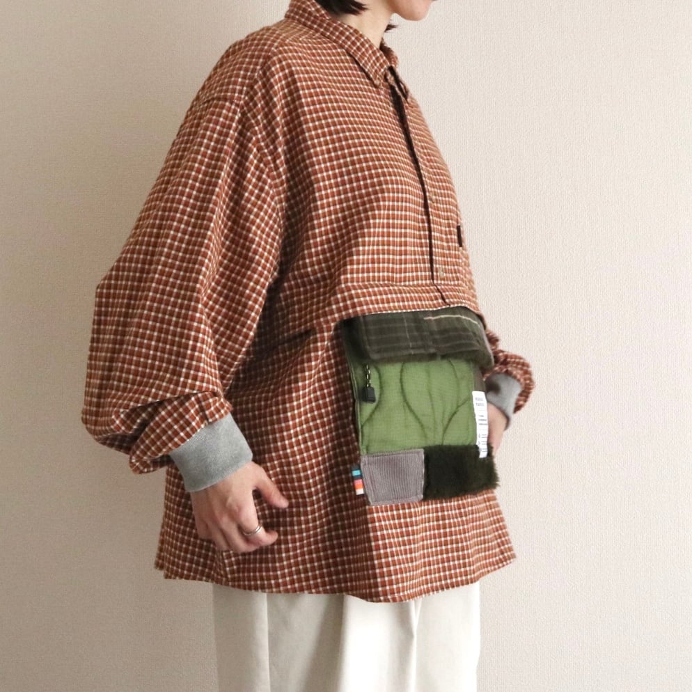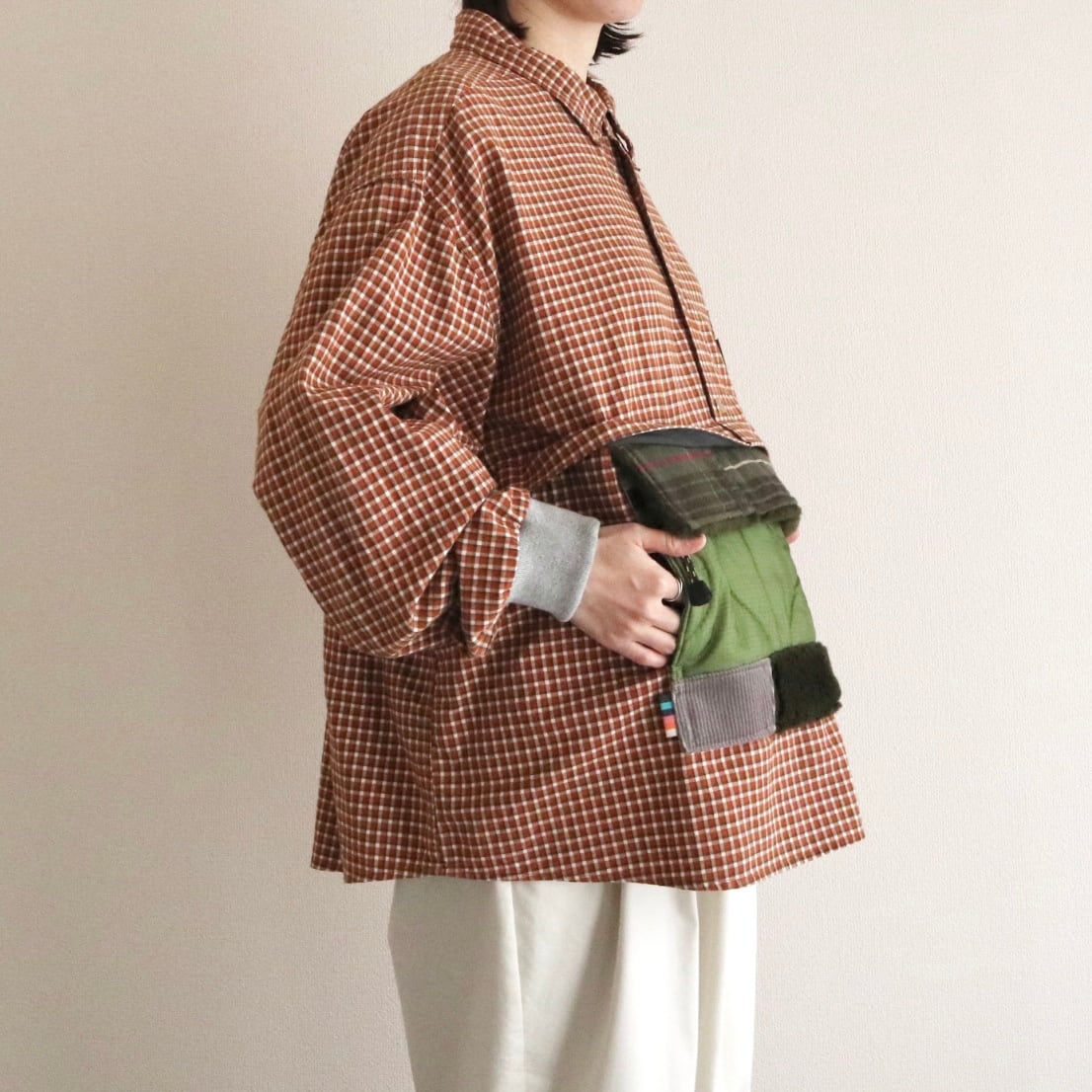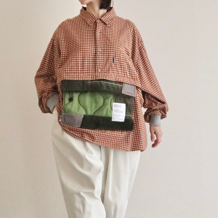 メンズサイズの古着のシャツを真ん中でカットしてカンガルーポケットをつけてます。