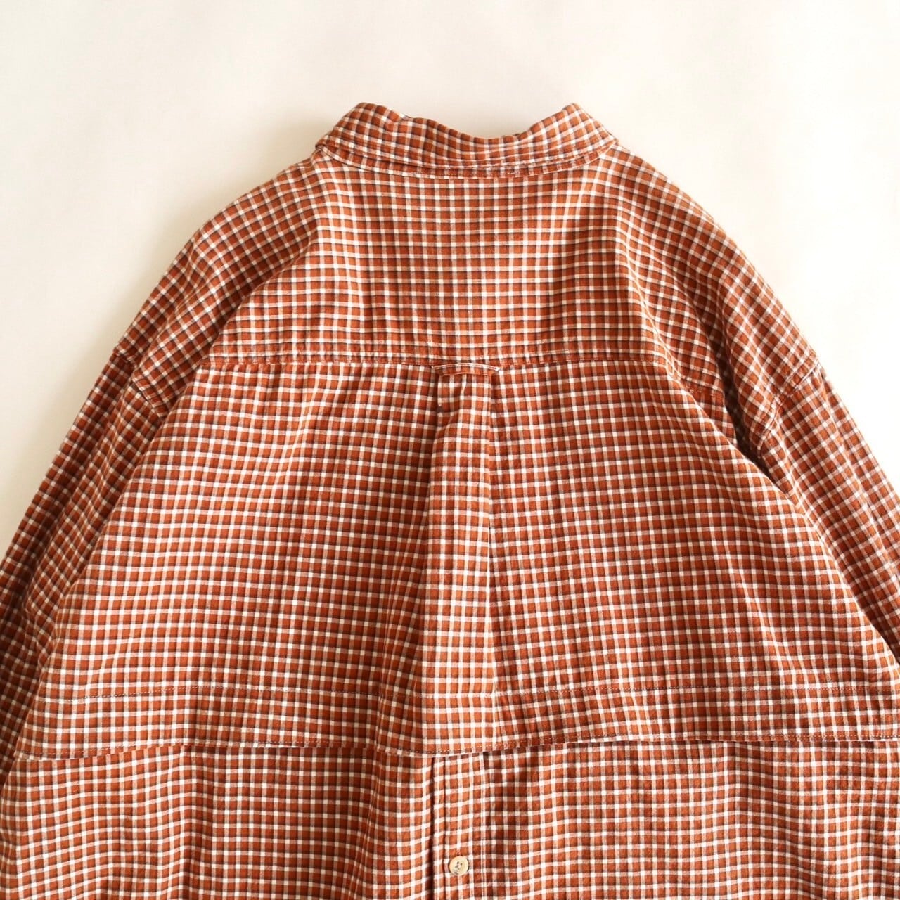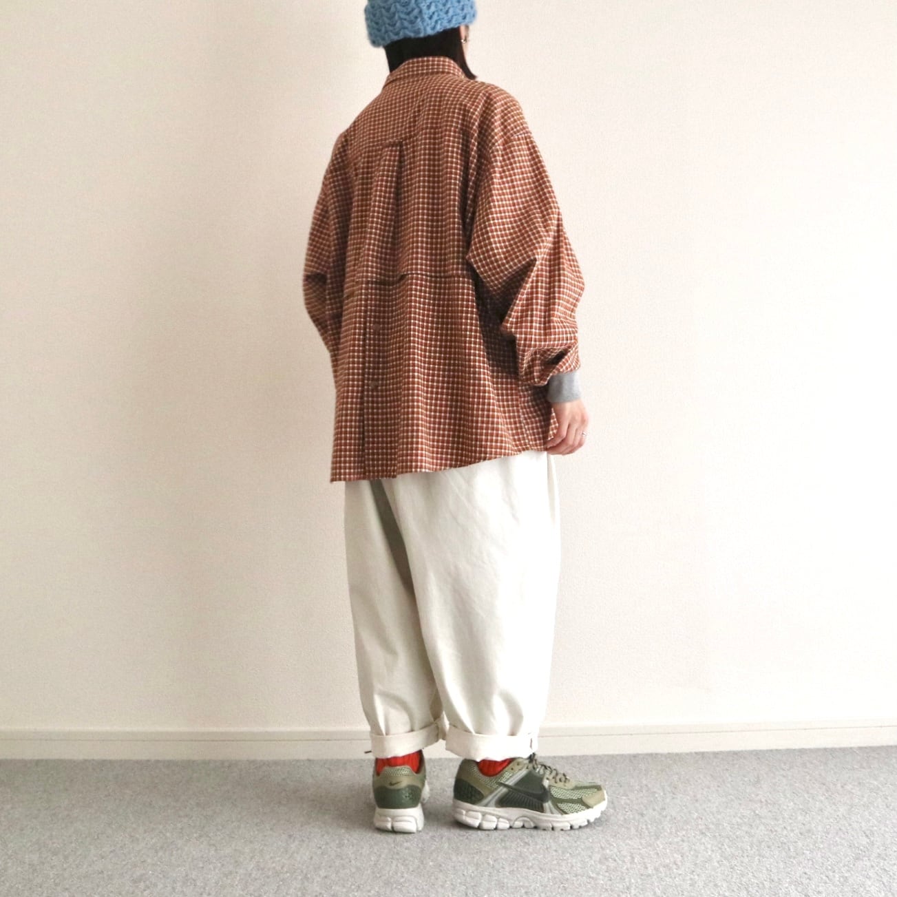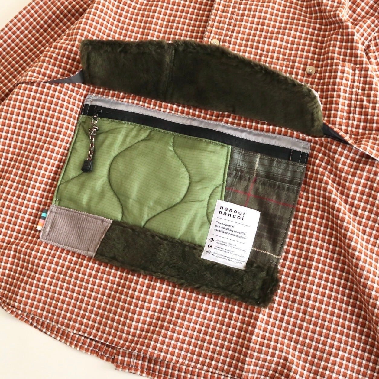 メンズサイズの古着のシャツを真ん中でカットしてカンガルーポケットをつけてます。